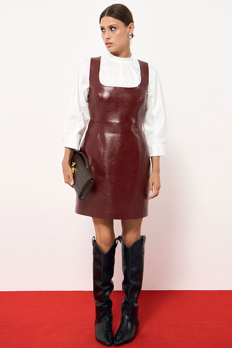 Платье в длине мини, выполнено из экокожи. По переду фигурный вырез, отрезное по линии талии, верх с рельефами. По спинке застежка на потайную молнию. Платье полностью на подкладке.