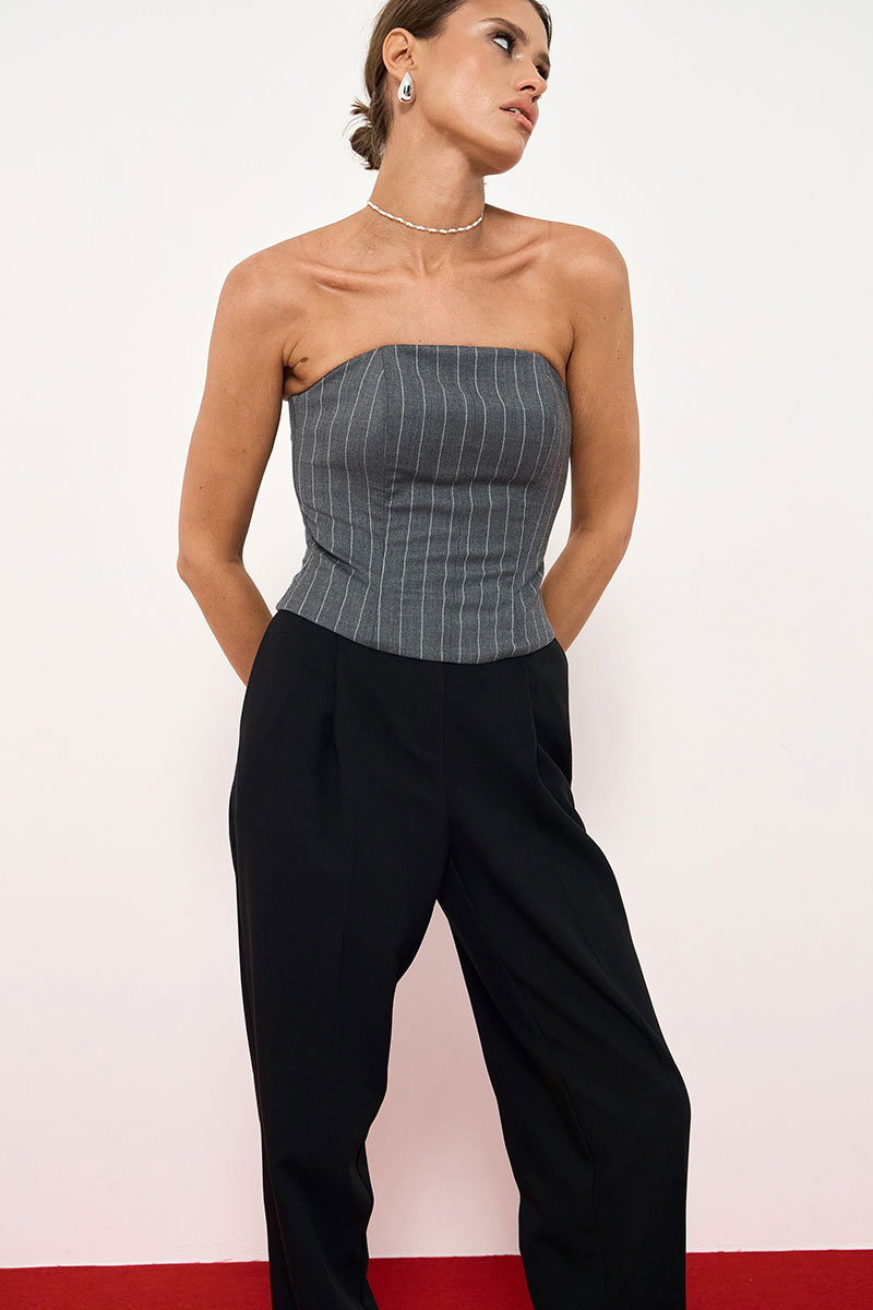 Топ, выполнен в корсетном стиле из костюмной ткани. По спинке застежка на разъемную металлическую молнию. Уважаемые покупатели, топ плотный по типу корсет, просим учитывать это при примерке, плотное облегание топа.