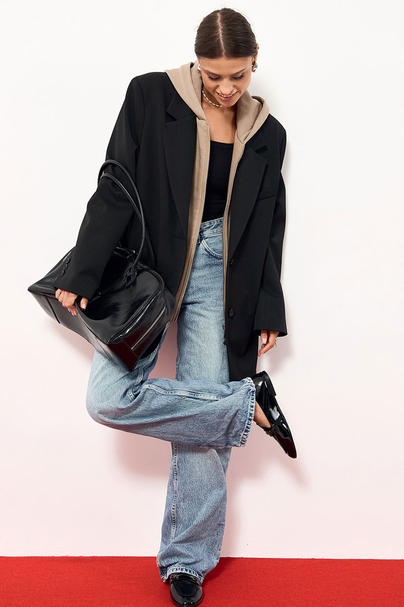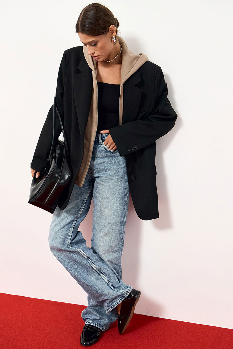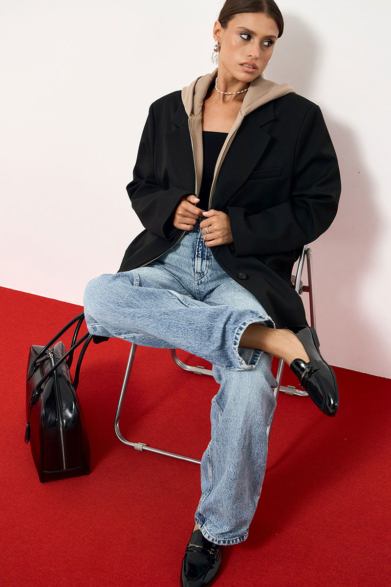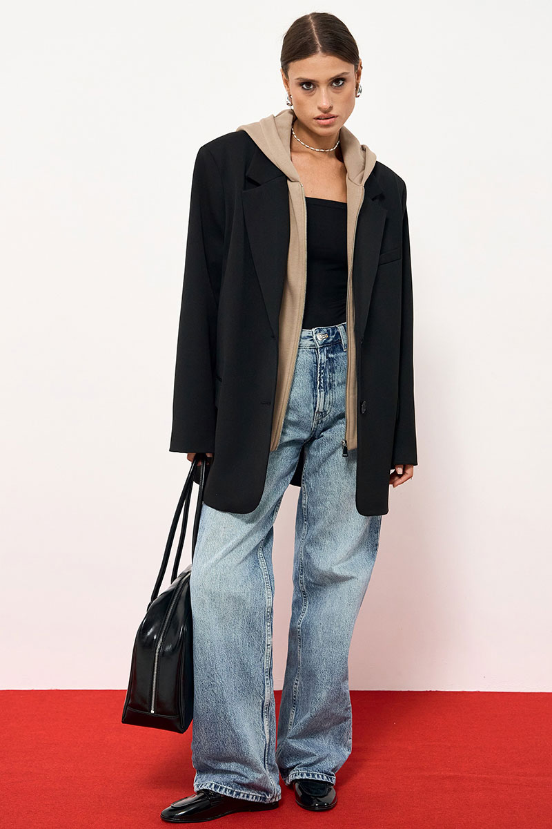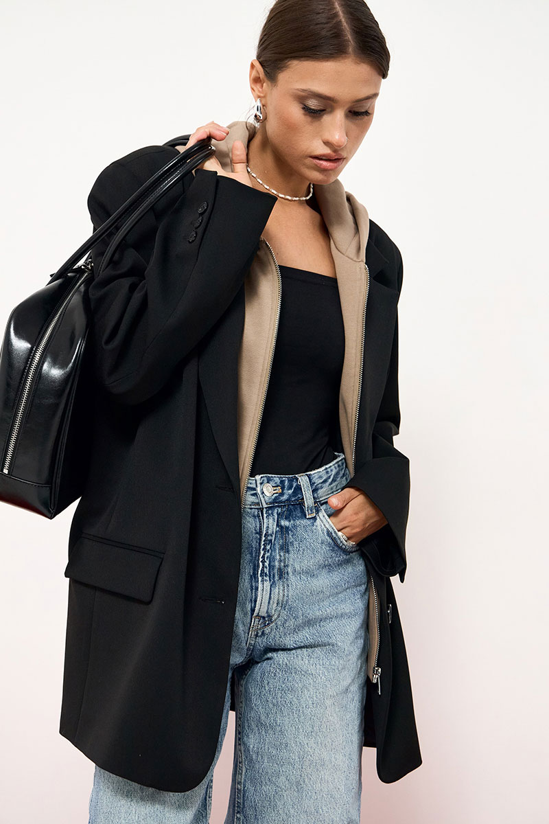 Жакет прямого свободного кроя. С имитацией худи с капюшоном, застежка молния. Жакет однобортный, по переду застежка на пуговицы. По бокам функциональные карманы. Жакет на подкладке.