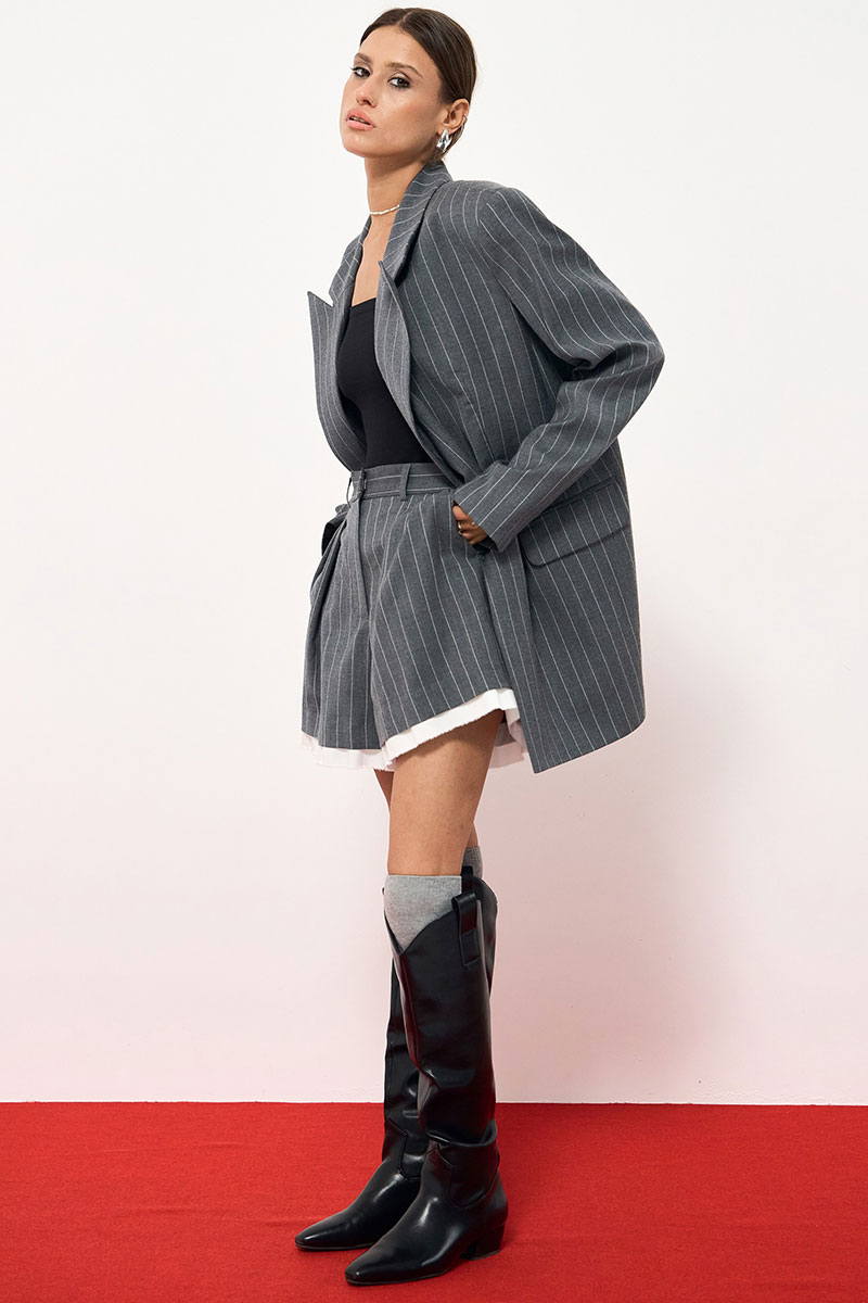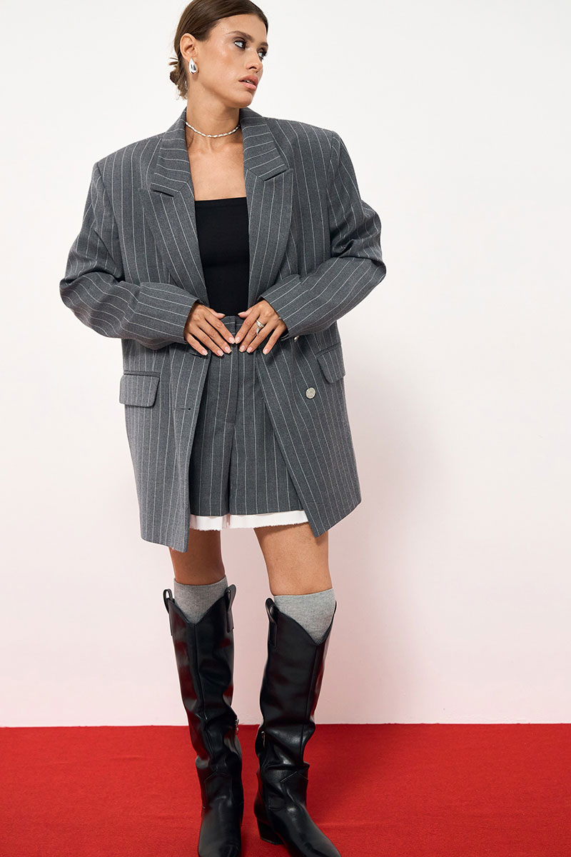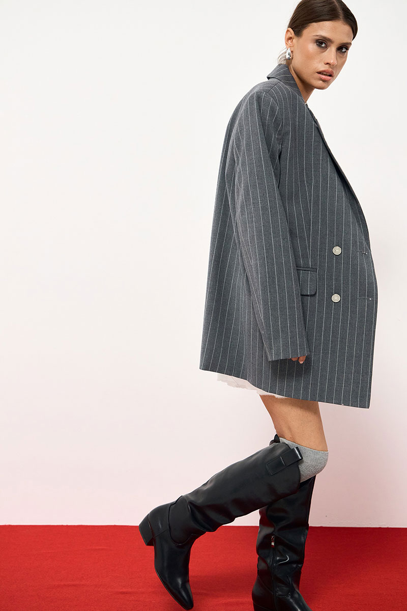 Жакет из костюмной ткани, прямого свободного силуэта. Жакет двубортный, с декоративными пуговицами, по бокам функциональные карманы. Линия плеча слегка увеличена, с подплечниками, рукав втачной. Жакет на подкладке.