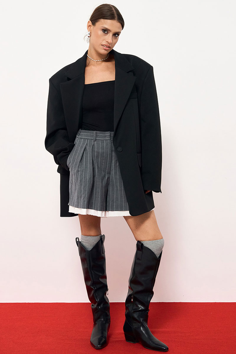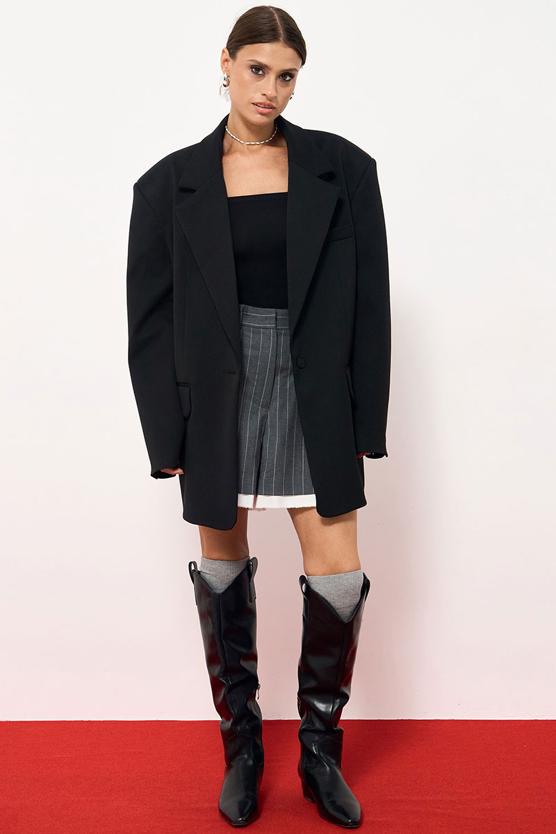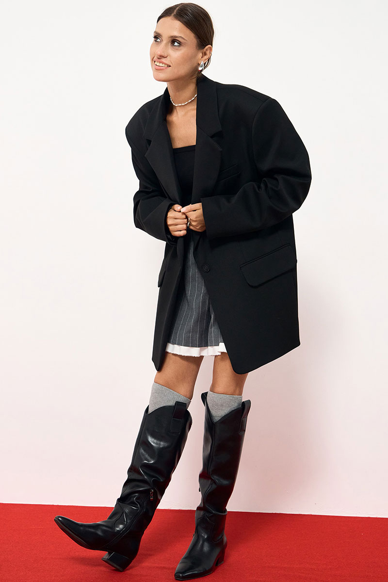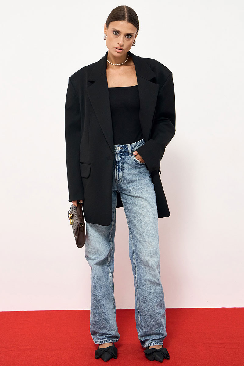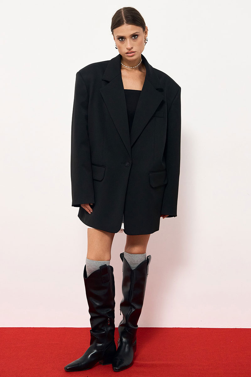 Жакет большого объема, прямого силуэта, на подкладке. Линия плеча расширенная, поддерживается высокими плечевыми накладками. Спинка со средним швом и шлицей. По переду прорезные карманы с клапаэном. Карман с листочкой с настрочными концами. Рукава втачные, длинные, двухшовные. По низу рукава открытая шлица. Воротник пиджачного типа на отрезной стойке. Отнобортная застежка на петлю-пуговицу.