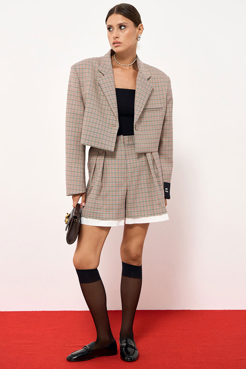 Комплект состоит из жакета и шорт в костюмно-плательной ткани.