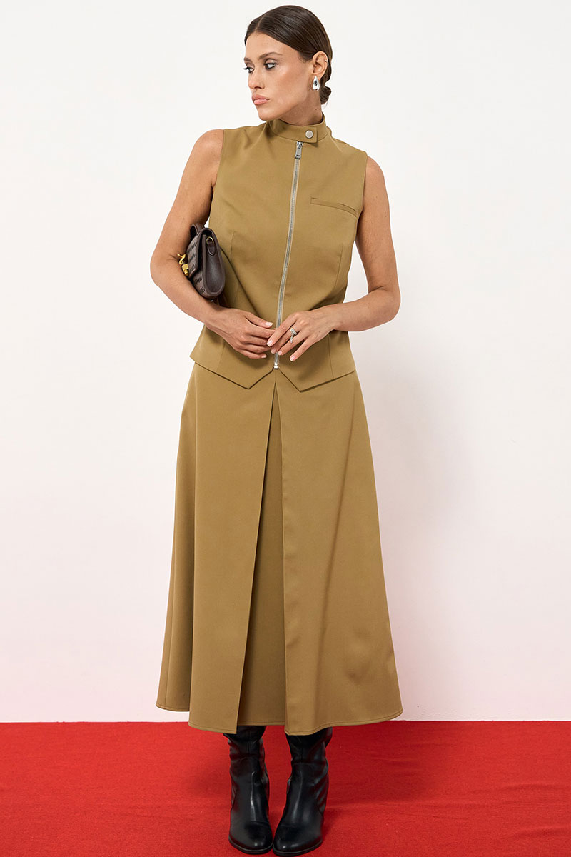 Жилетка прямого, слегка приталенного силуэта, из костюмной ткани, по переду на молнии, горловина стойка на кнопке, по переду на груди имитация кармана с листочкой. По переду и по спинке выточки. Жилет на подкладке.