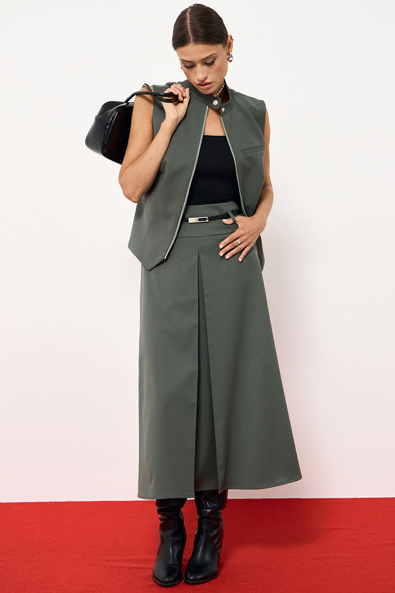 Юбка в длинке миди из костюмной ткани. По переду юбки встречная складка. По линии талии шлевки для пояса.В комплекте декоративный пояс. Застежка по спинке на потайную молнию.