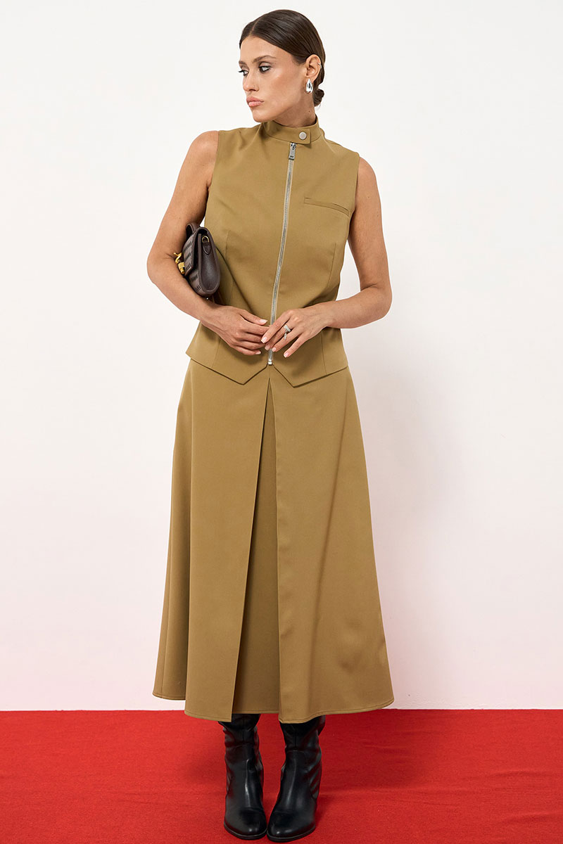 Юбка в длинке миди из костюмной ткани. По переду юбки встречная складка. По линии талии шлевки для пояса. В комплекте декоративный пояс. Застежка по спинке на потайную молнию.