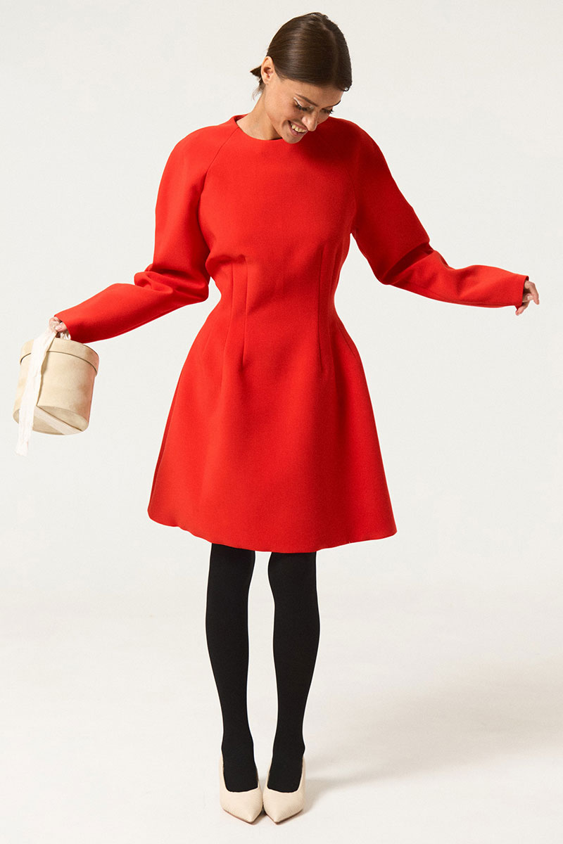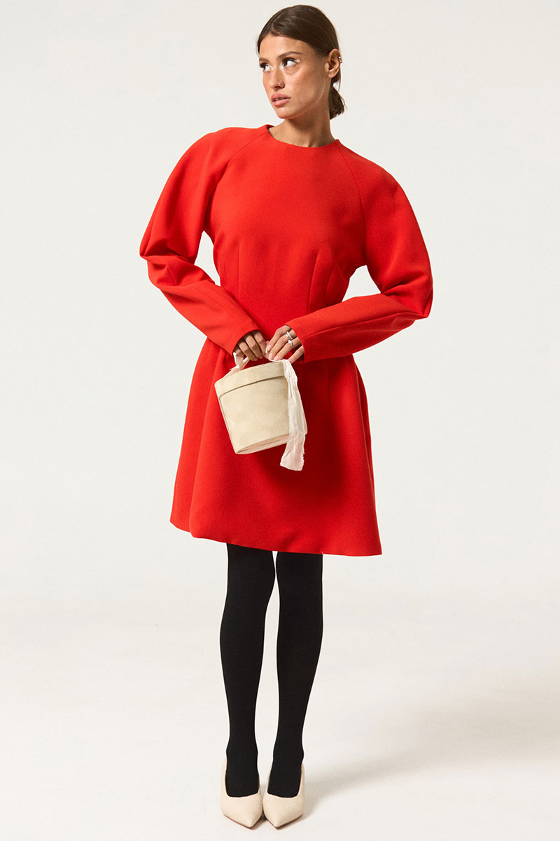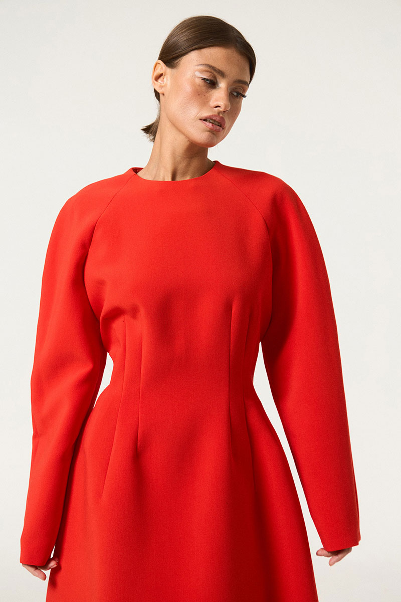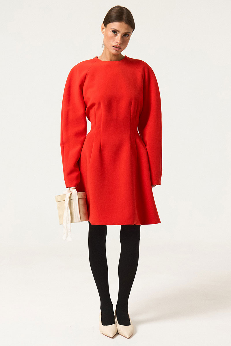 Платье приталенного силуэта с объемными рукавом реглан. Платье в длине мини. Платье с вытачками.