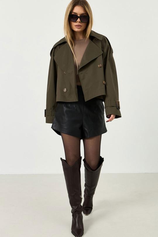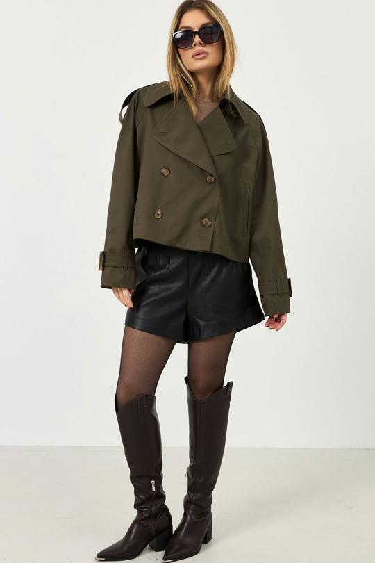 Укороченный тренч из плащевой ткани. По переду застежка на пуговицы. Спущенная линия плеча, по низу рукава манжета с патой.