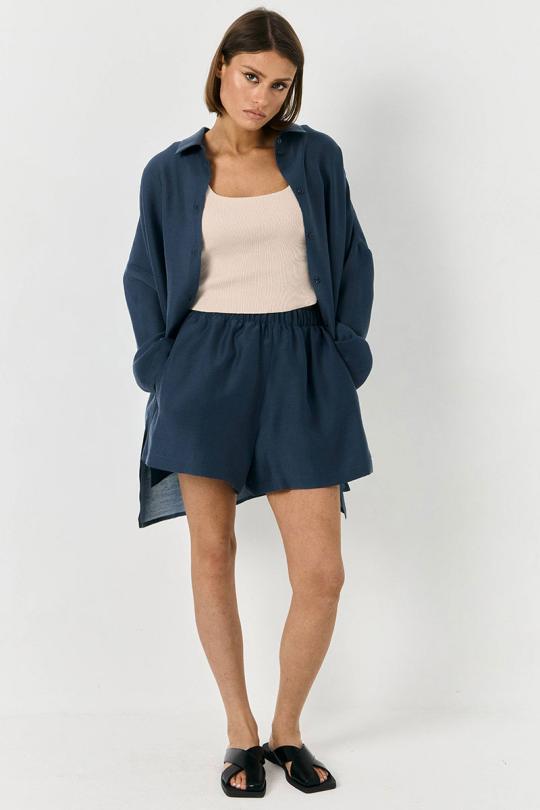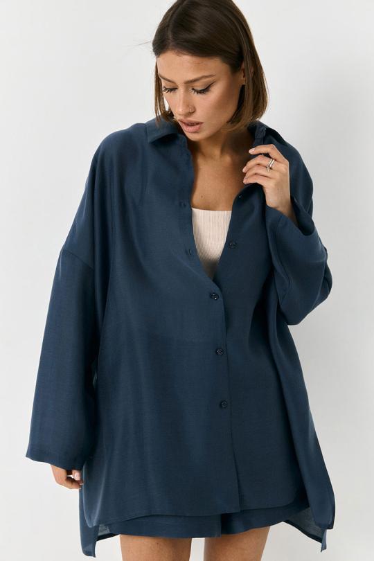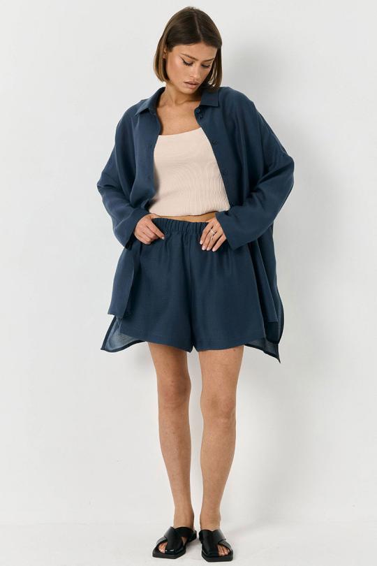 Комплект двойка в синем цвете из ткани - вуаль. Комплект состоит из рубашки и шорт.