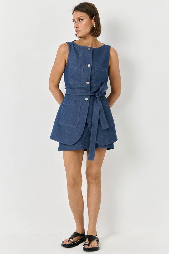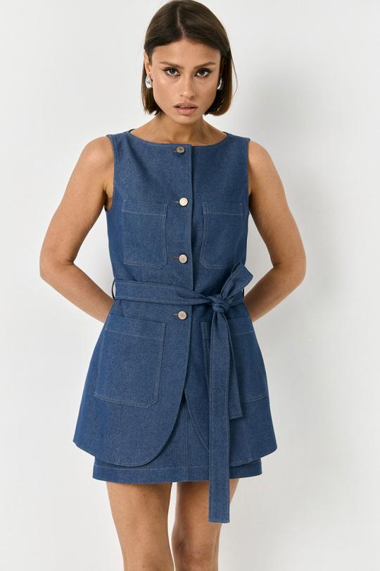 Жилет из плотной хлопковой джинсовой ткани. Жилет полуприлегающего силуэта, на подкладке. По переду застежка на пуговицы. По переду накладные карманы и пояс из основной ткани изделия.