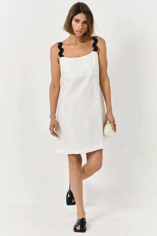Плятье прямого свободного силуэта, с декоративными брителями, выполнено из льна. Бретели стабильные.