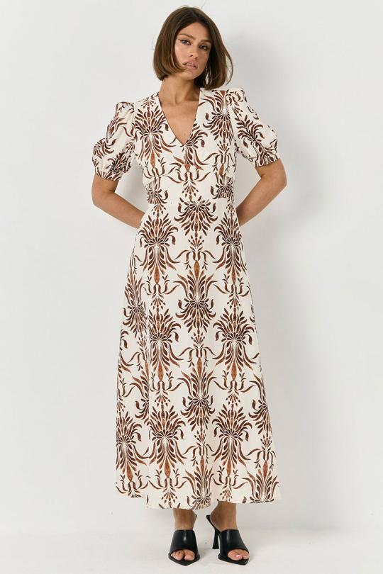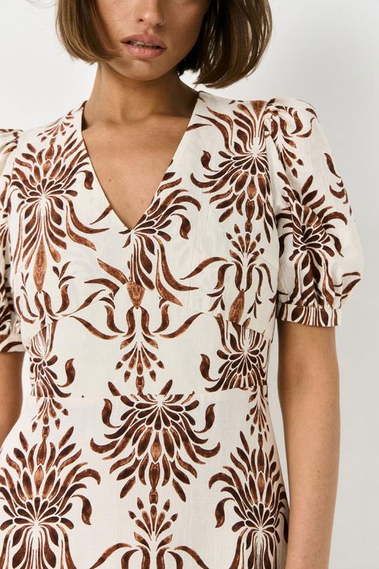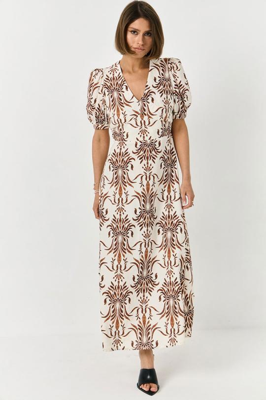 Платье в длине макси из вискозы с актуальным летним принтом. По переду V-образный вырез. Рукав втачной со сборкой. По низу рукава небольшая манжета на пуговице. По спинке потайная молния.