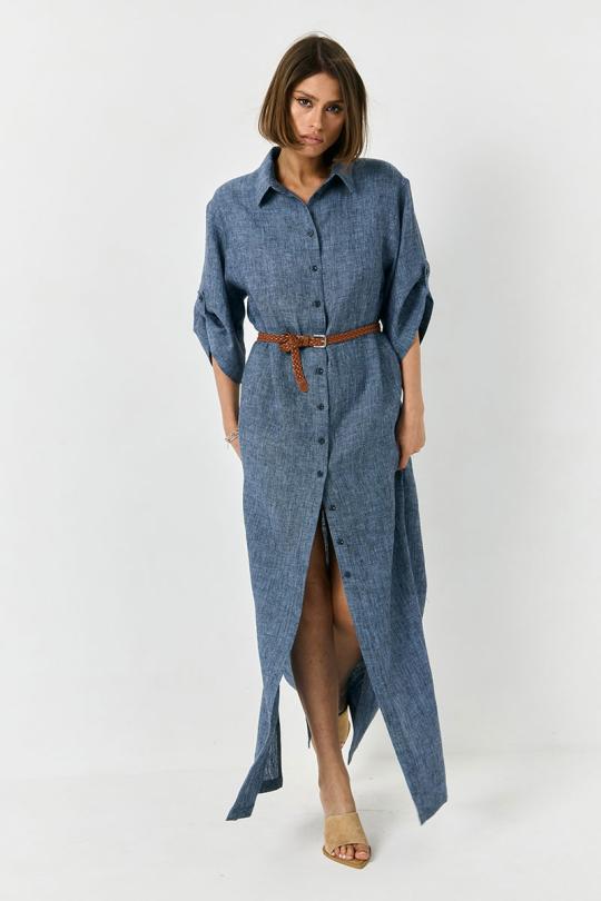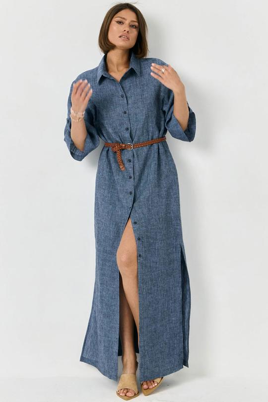 Платье в длине макси, полуприлегающего силуэта. По переду застежка на ряд пуговиц, вы сами можете регулировать длину разреза. В комплекте съемный декоративный пояс. Рукав спущенный, с небольшой пуговицей. По бокам изделия разрезы.