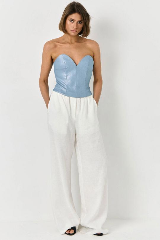 Брюки свободного кроя, выполнены из льна, пояс на резинке, по бокам функциональные карманы.