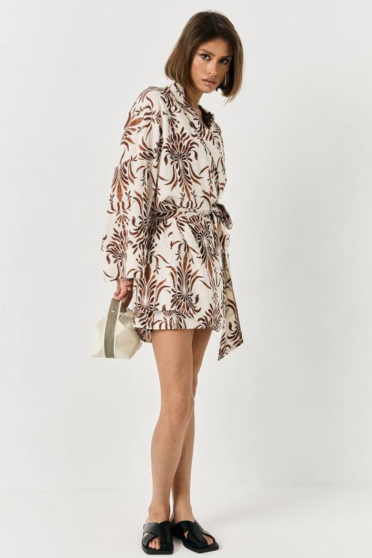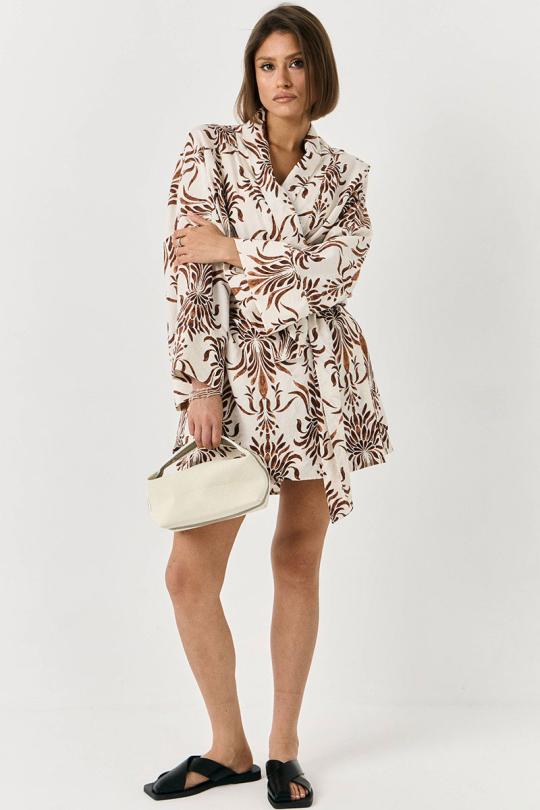 Рубашка прямого свободного кроя. Рукав на манжете. Рубашка со съемным поясом из основной ткани изделия.