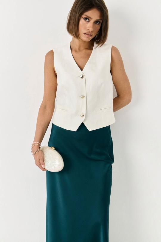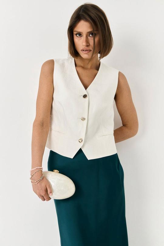 Жилет полуприлегающего силуэта, выполнен из льна. По переду застежка на небольшие декоративные пуговицы. Жилетка с прорезными нефункциональными карманами. По переду изделия небольшие вытачки.