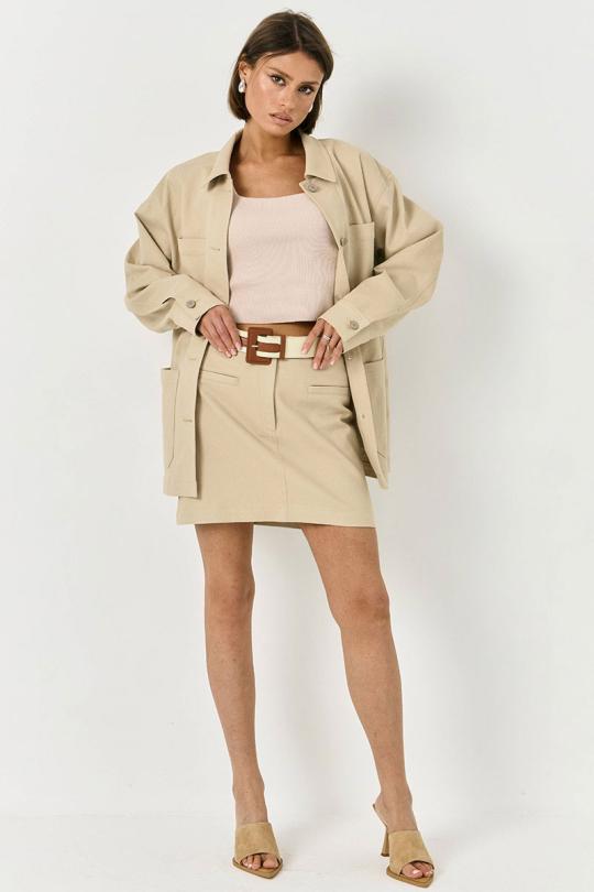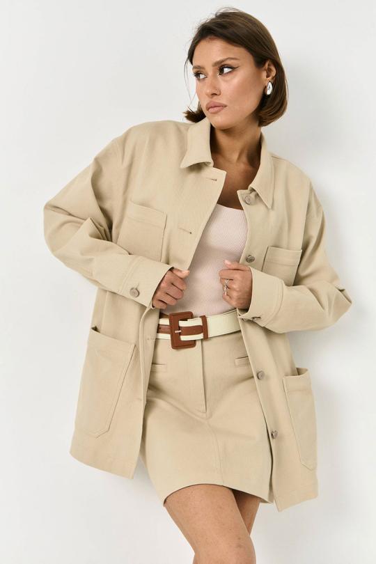Рубашка прямого свободного силуэта, выполнена их хлопковой, джинсовой ткани, в бежевом цвете. По переду накладные карманы, застежка на пуговицы. Рукав спущенный, по низу рукав на манжете и пуговице.