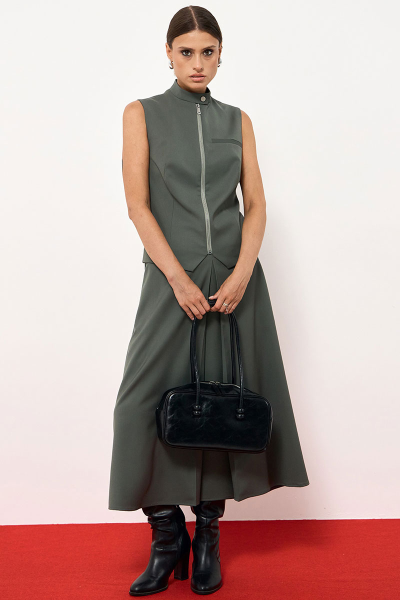 Жилетка прямого, слегка приталенного силуэта, по переду на молнии, горловина стойка на кнопке, по переду на груди имитация кармана с листочкой. По переду и по спинке выточки. Жилет на подкладке.