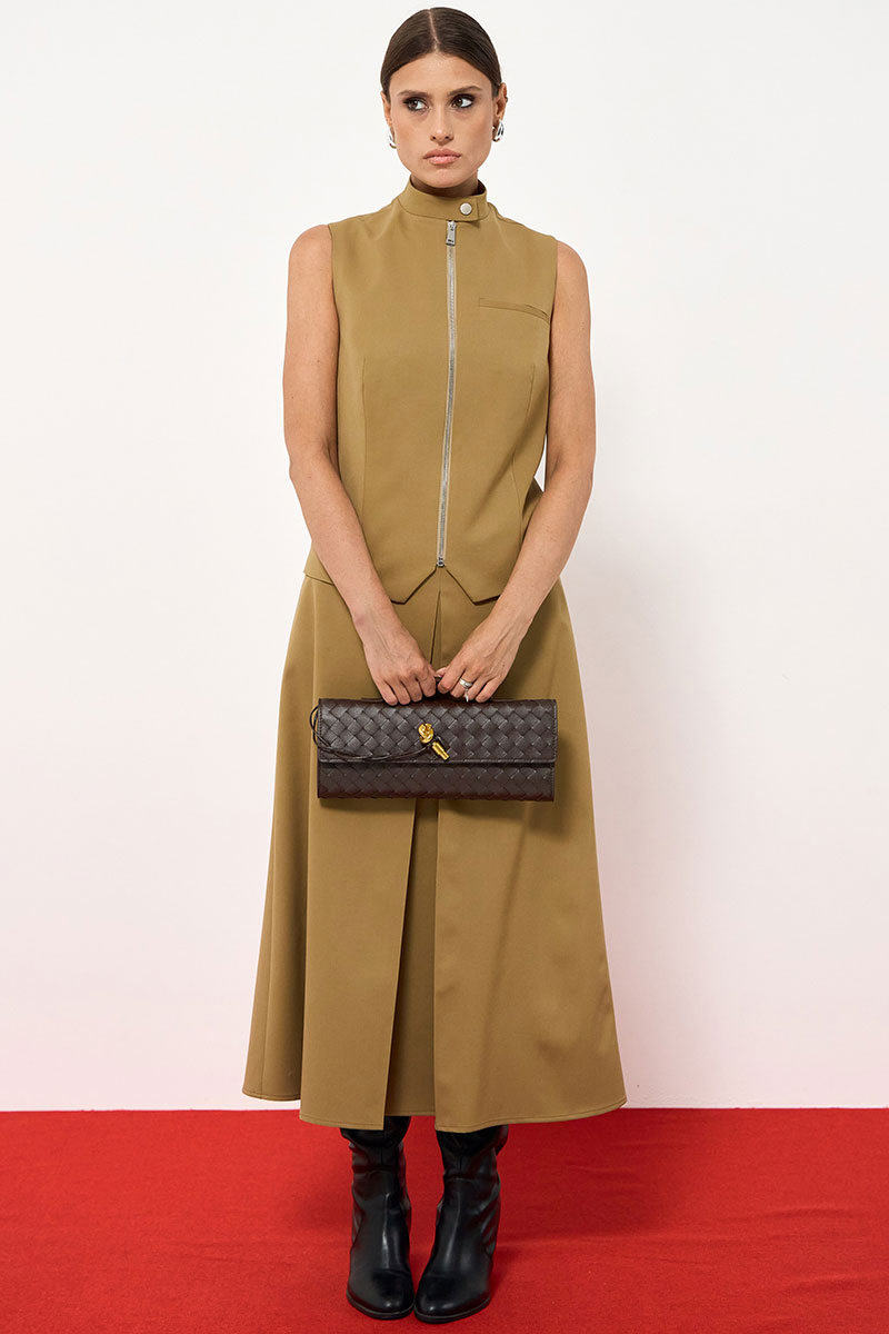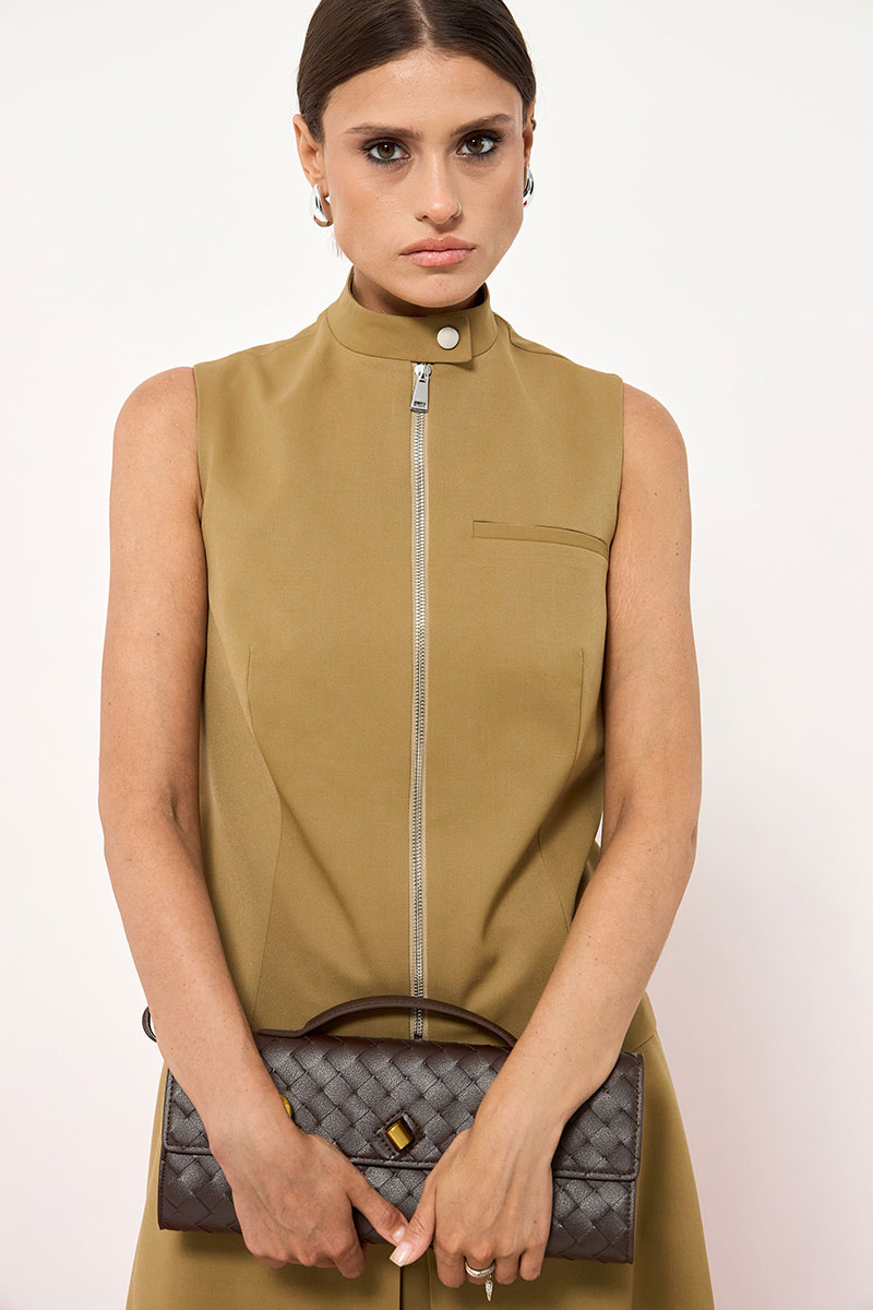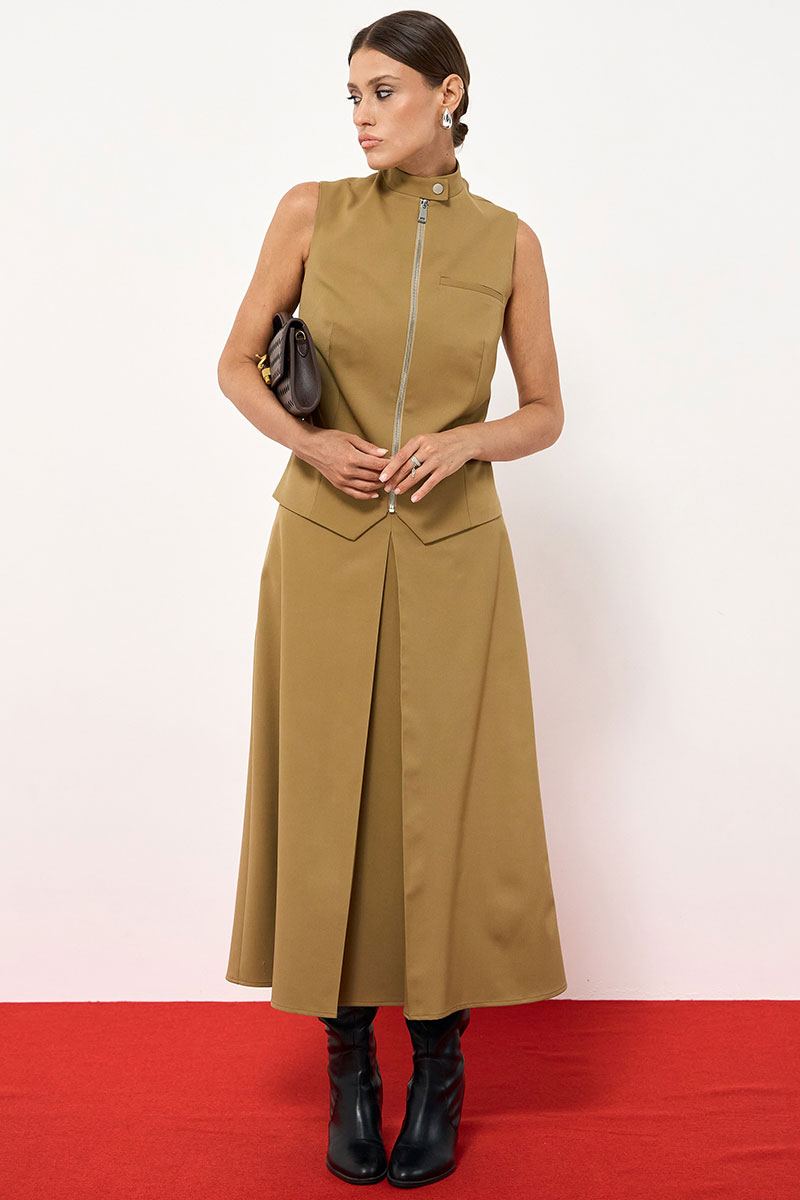 Жилетка прямого, слегка приталенного силуэта, по переду на молнии, горловина стойка на кнопке, по переду на груди имитация кармана с листочкой. По переду и по спинке выточки. Жилет на подкладке.