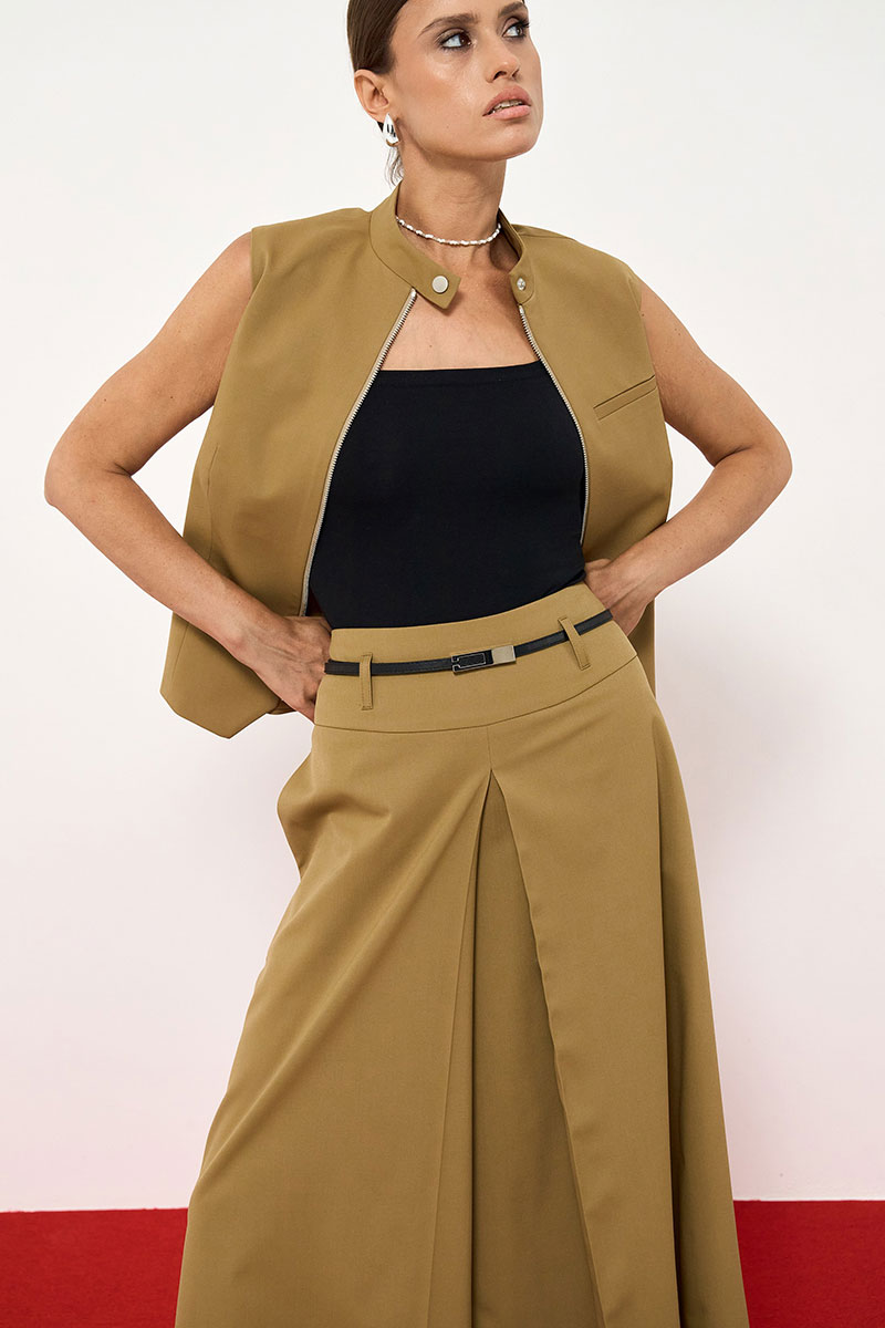 Юбка в длинке миди. По переду юбки встречная складка. По линии талии шлевки для пояса. В комплекте декоративный пояс. Застежка по спинке на потайную молнию.