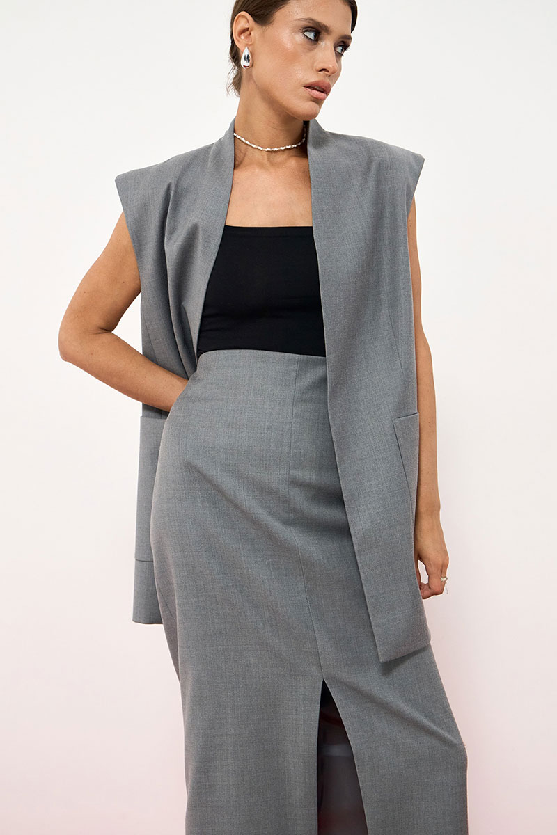 Юбка в длине миди, прямого силуэта, по переду разрез в среднем шве до середины изделия. Юбка на обтачке, с потайной молнией по спинке изделия.