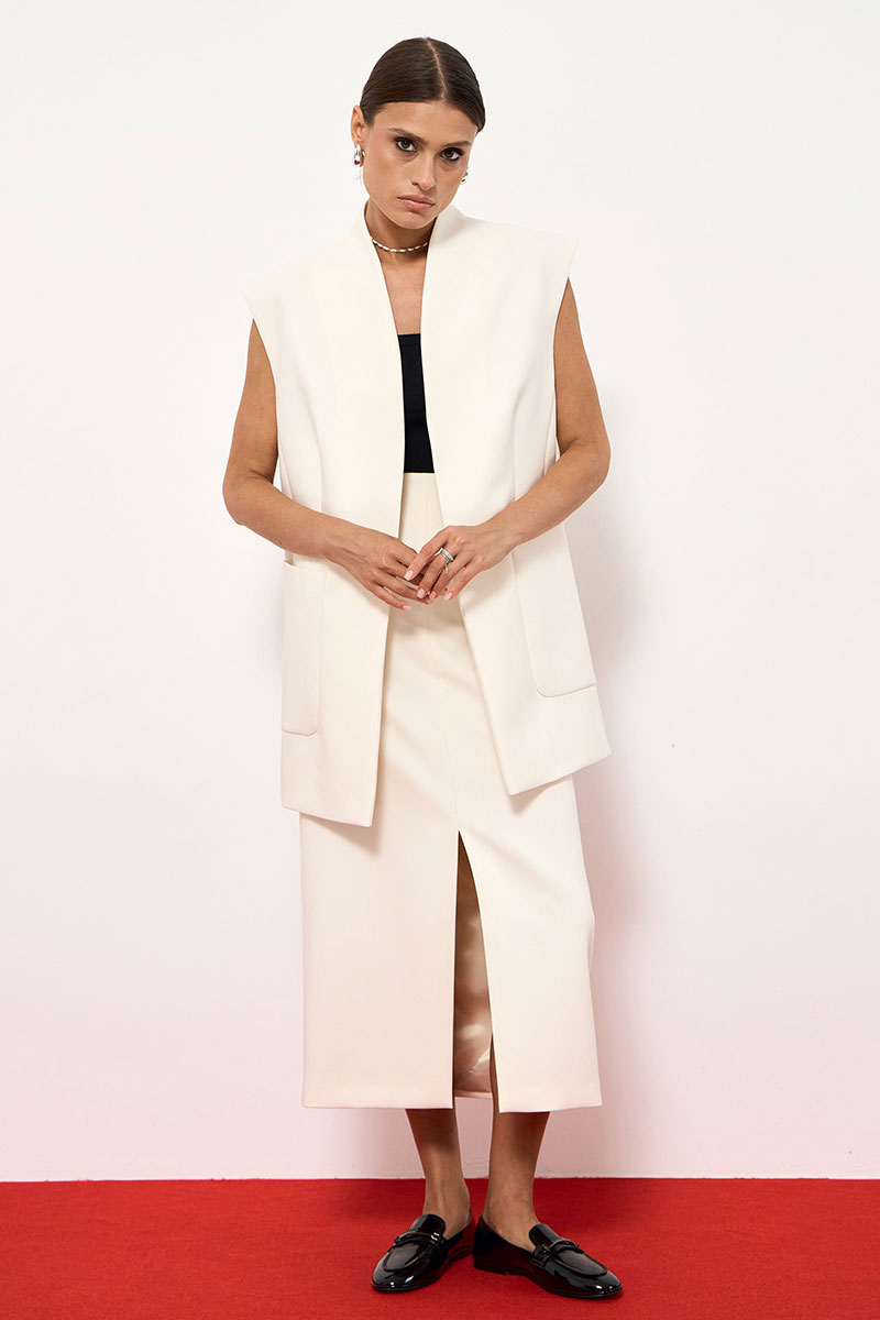 Юбка в длине миди, прямого силуэта, по переду разрез в среднем шве до середины изделия. Юбка на обтачке, с потайной молнией по спинке изделия.