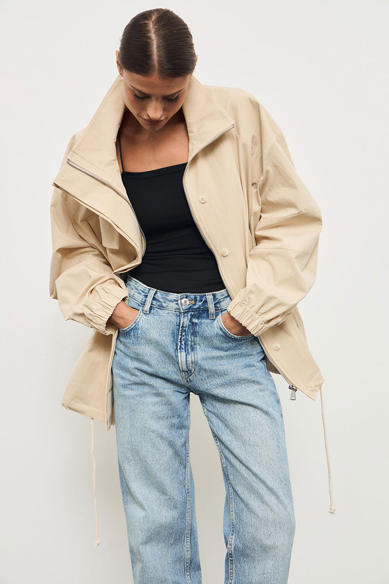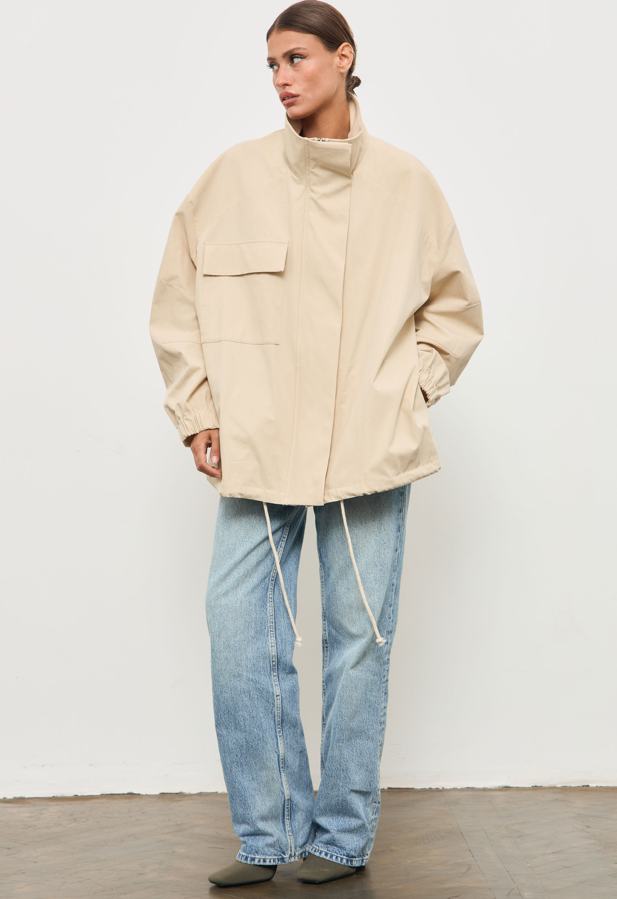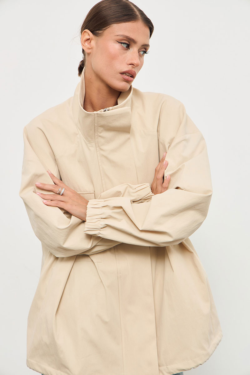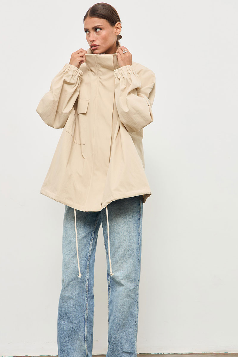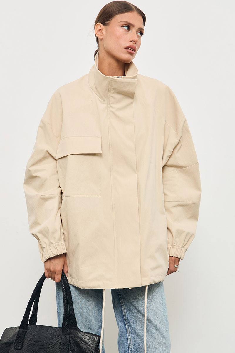 Куртка из хлопковой ткани, большого объема, со спущенной линией плеча. По переду накладной карман, застежка на молнию и приточную планку на пуговицах. Рукав одношевный, низ обработан эластичной тесьмой. По низу куртки кулиса с декоративным шнурком. Воротник стойка.