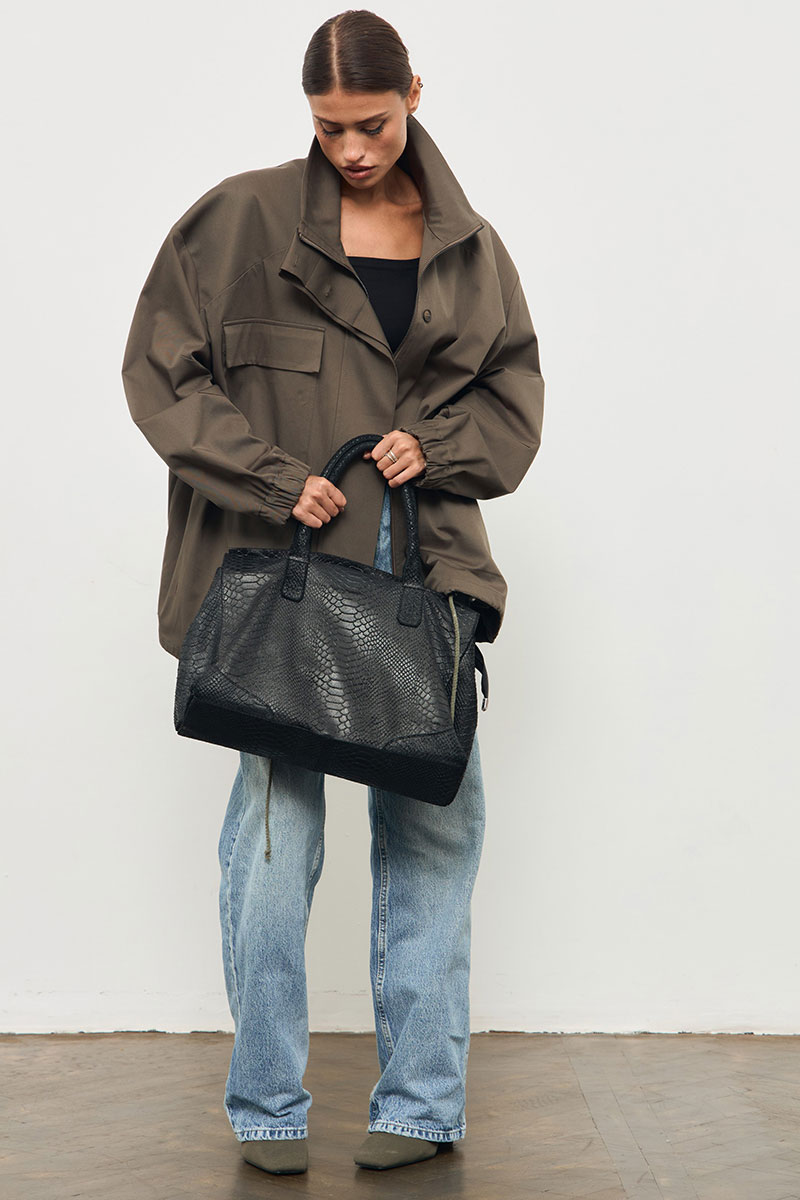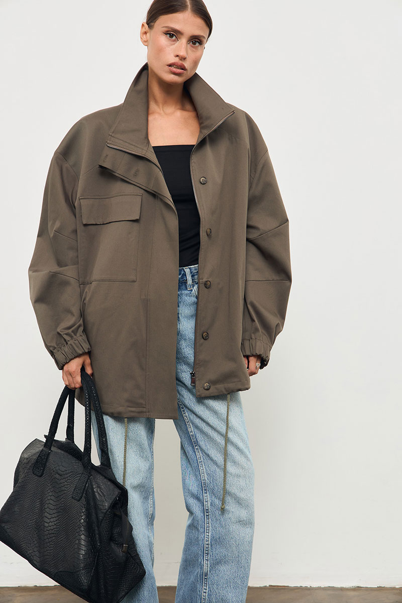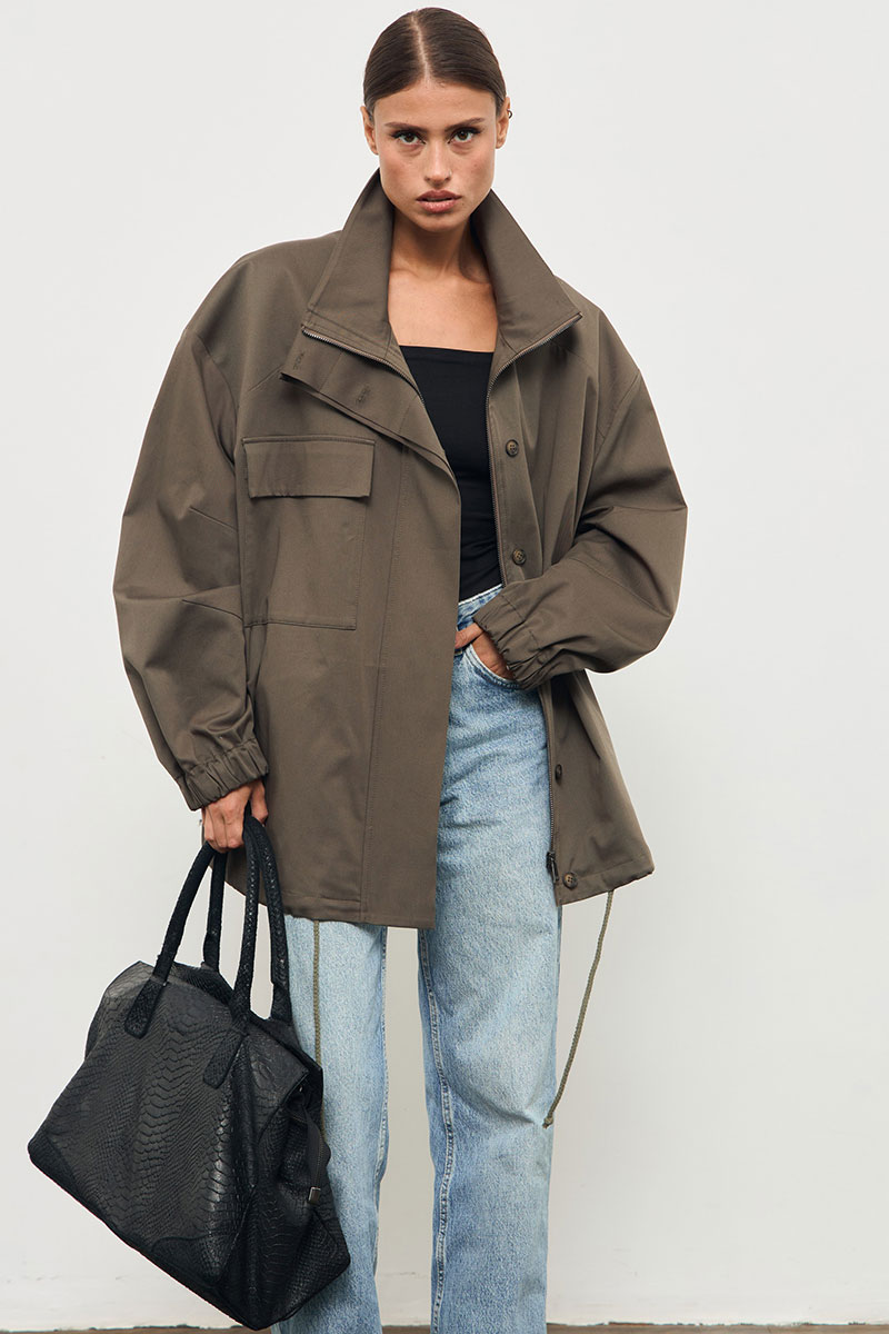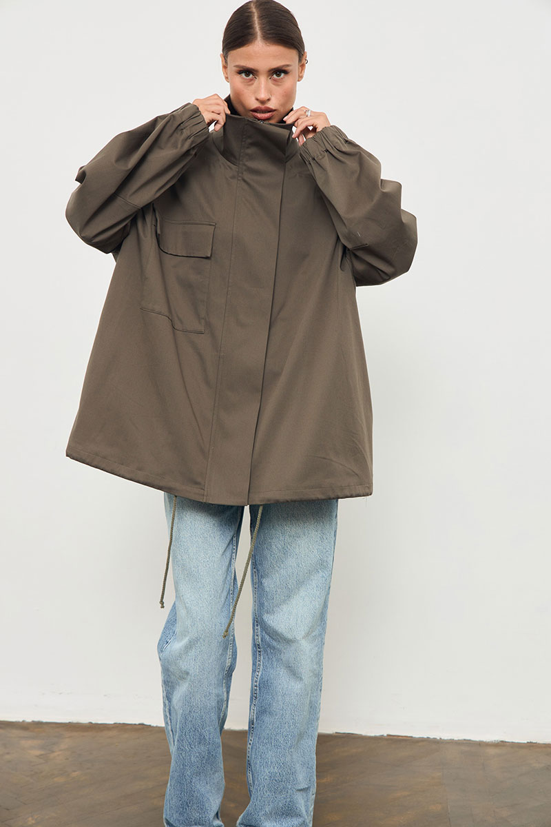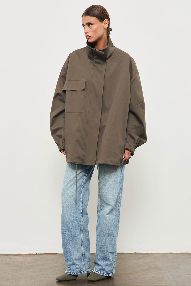 Куртка из хлопковой ткани, большого объема, со спущенной линией плеча. По переду накладной карман, застежка на молнию и приточную планку на пуговицах. Рукав одношовный, низ обработан эластичной тесьмой. По низу куртки кулиса с декоративным шнурком. Воротник стойка.