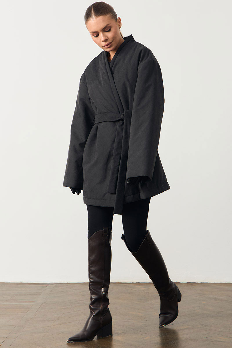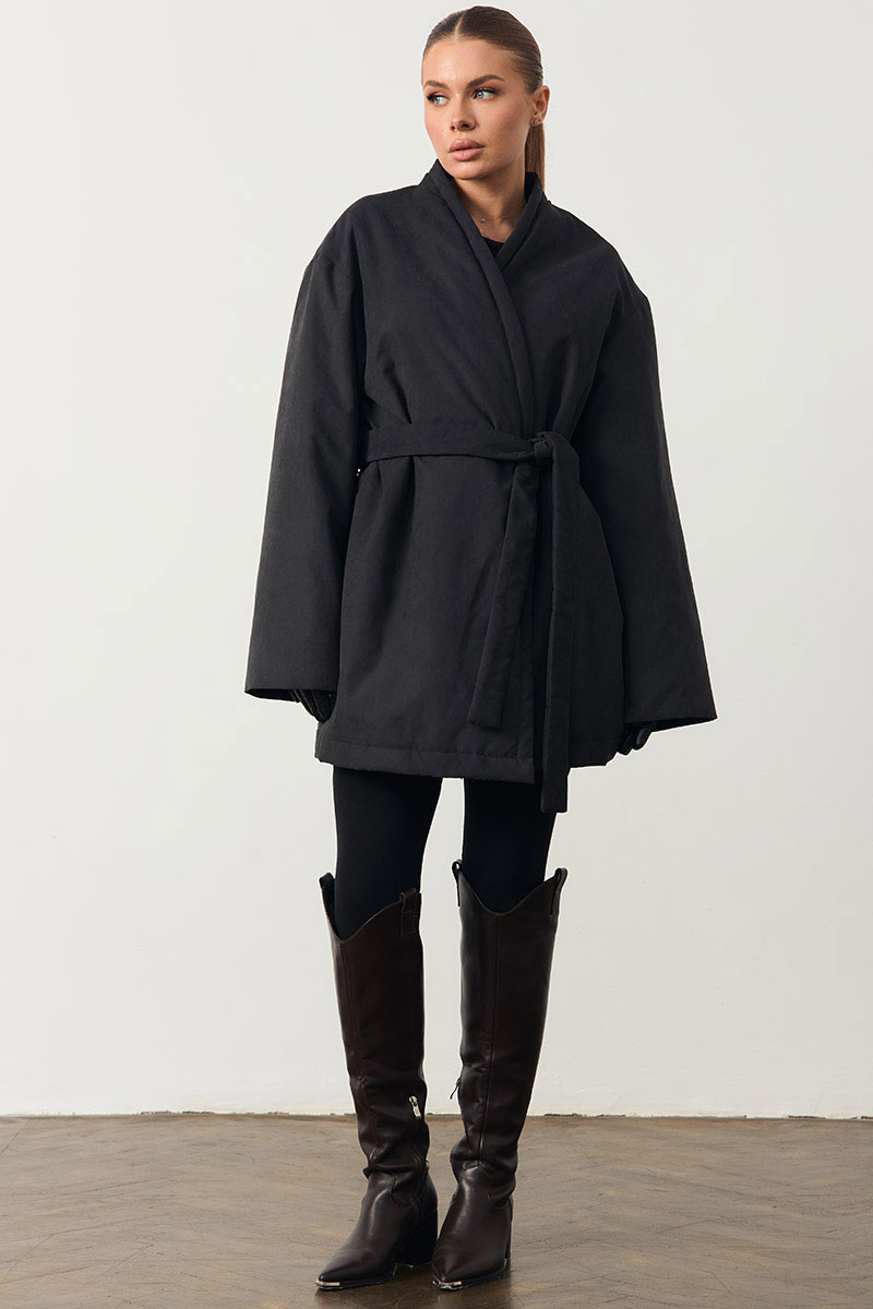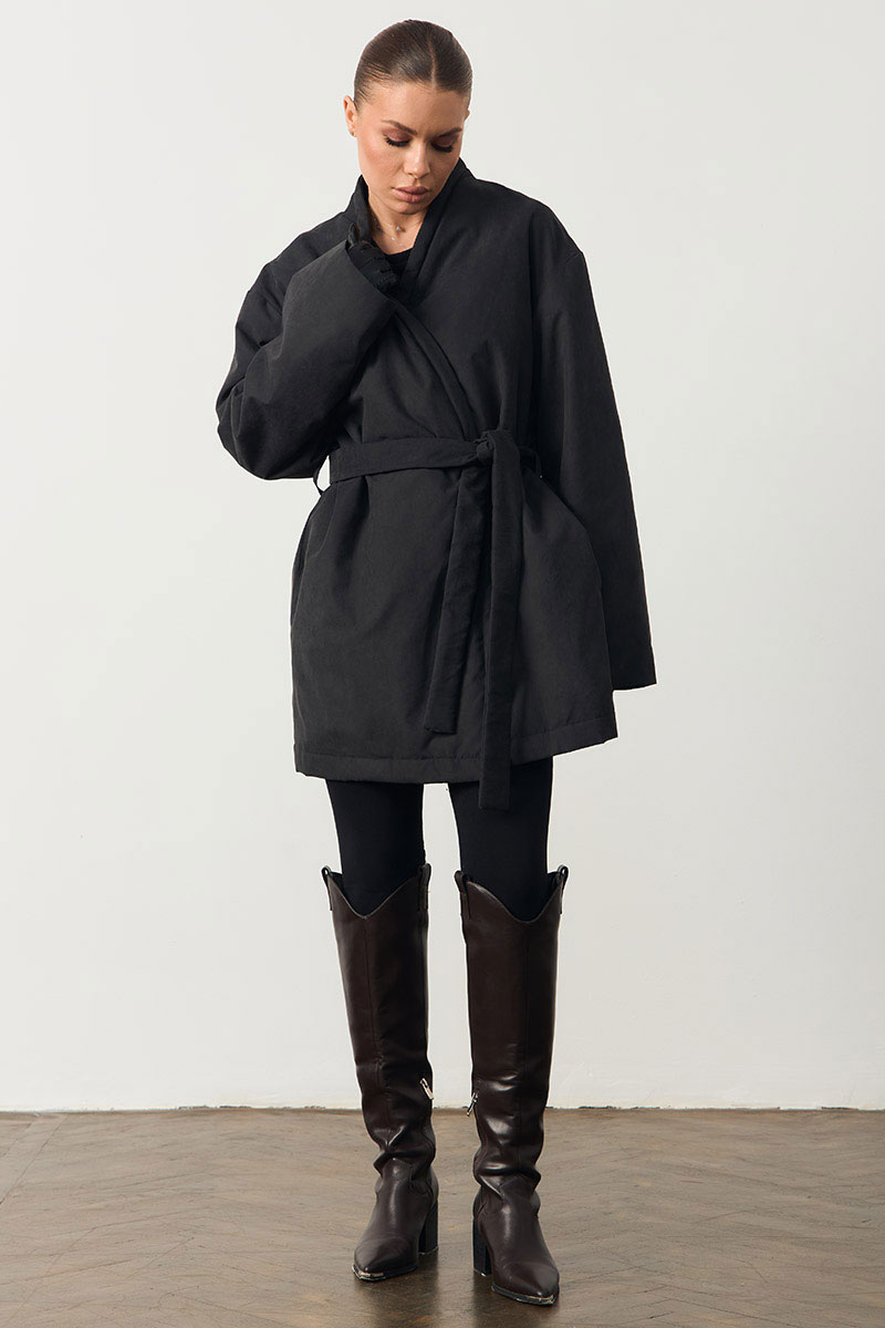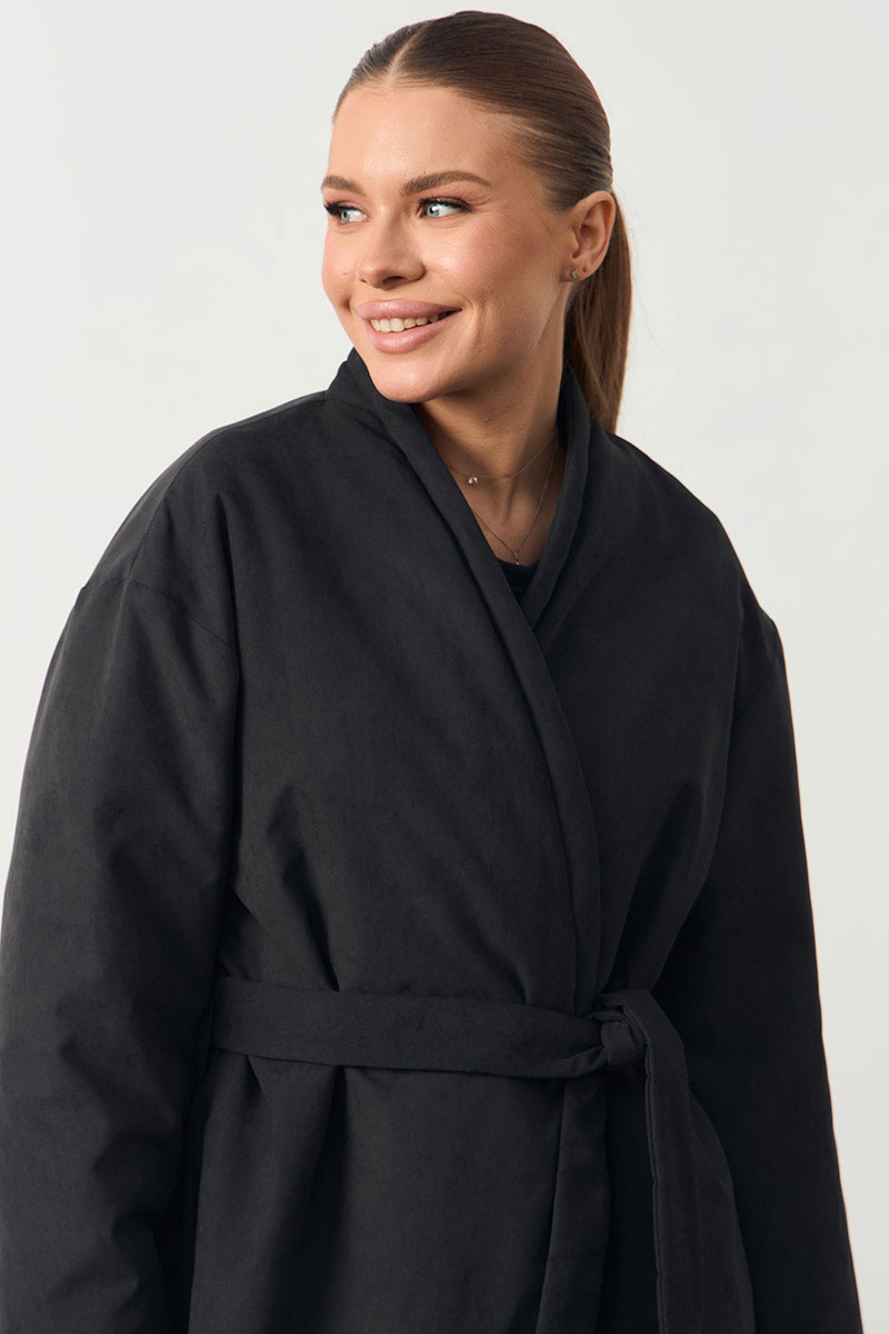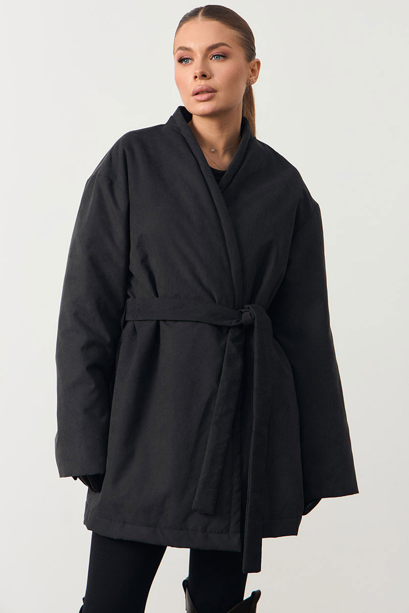 Куртка-кимоно из водостойкой плащёвой ткани. В боковых швах карманы. По краю борта отстрочки. Модель с поясом.