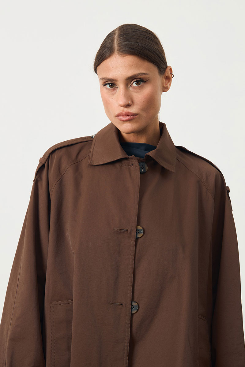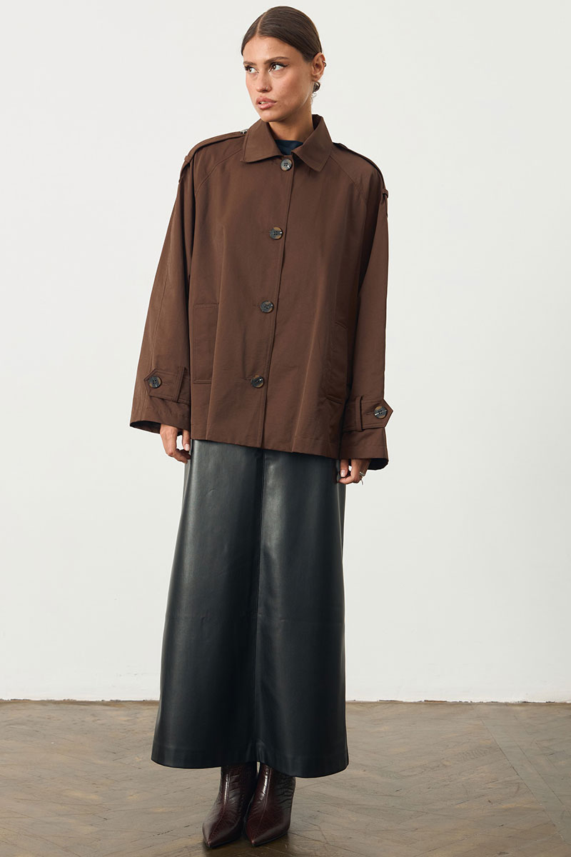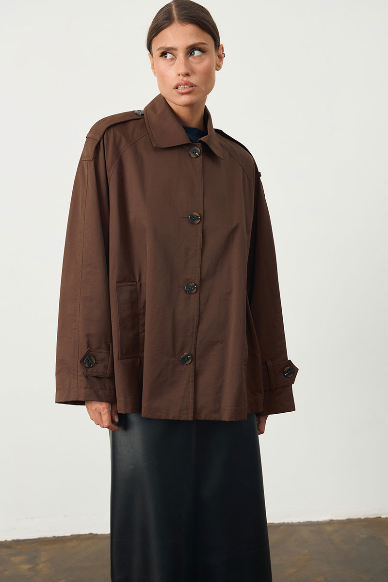 Укороченный тренч из хлопковой ткани с водоотталкивающей пропиткой. Изделие с застежкой на пуговицы. Воротник рубашечного типа. По переду модели карманы с широкой листочкой. Рукав-реглан, расширенный с отделкой в виде пат по плечевому срезу и низу элемента.