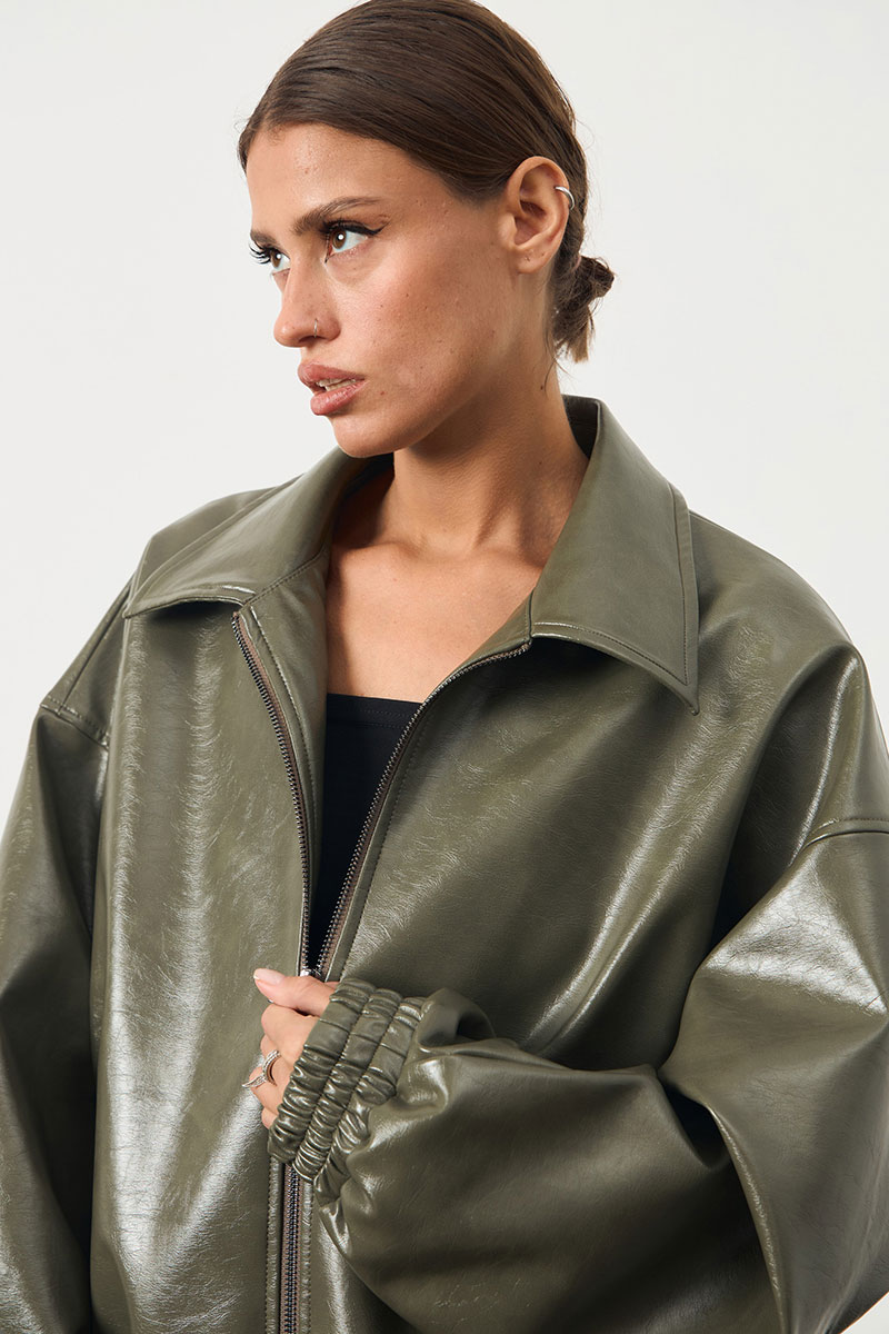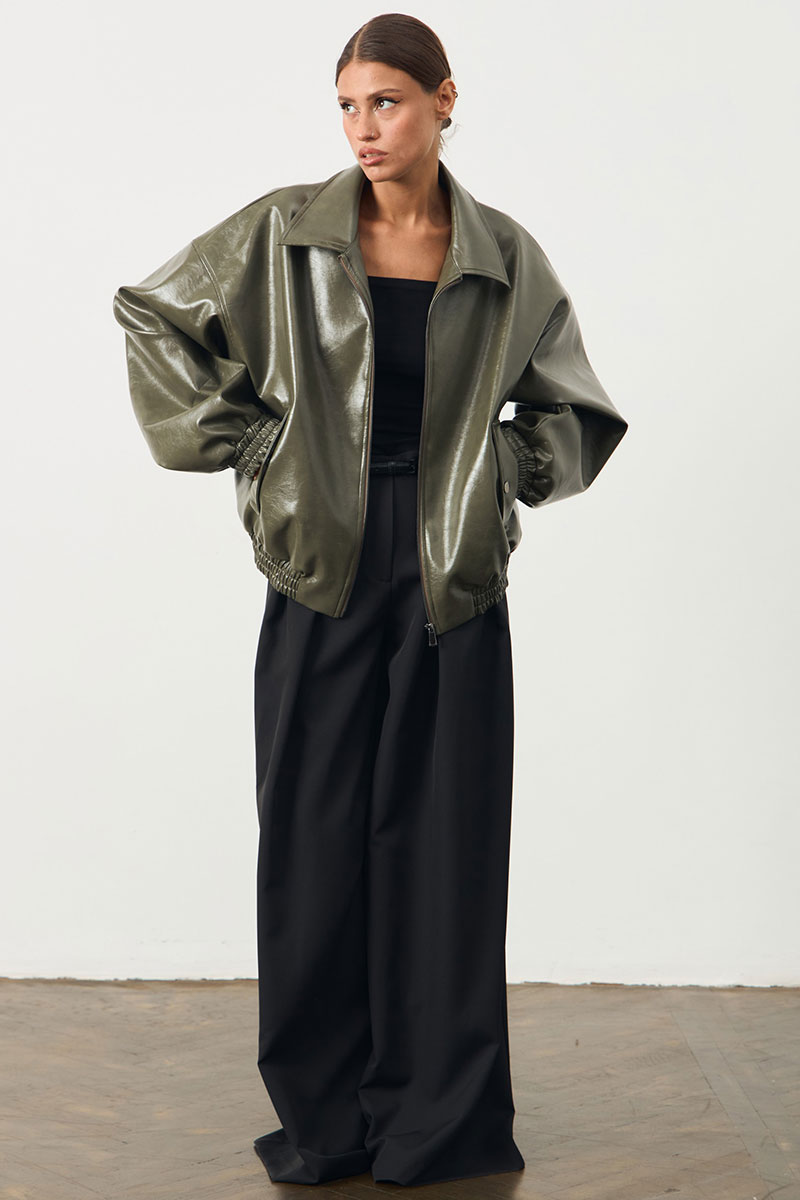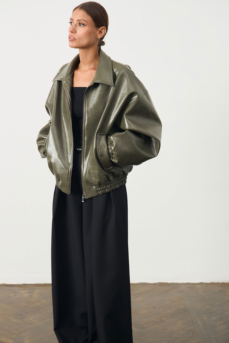 Куртка прямого силуэта из экокожи. По переду куртки прорезные карманы с клапанами. На спинке кокетка. Воротник рубашечного типа. Рукав широкий с манжетой на резинке. Низ изделия обработан притачным поясом на резинке. Застежка-молнния.
