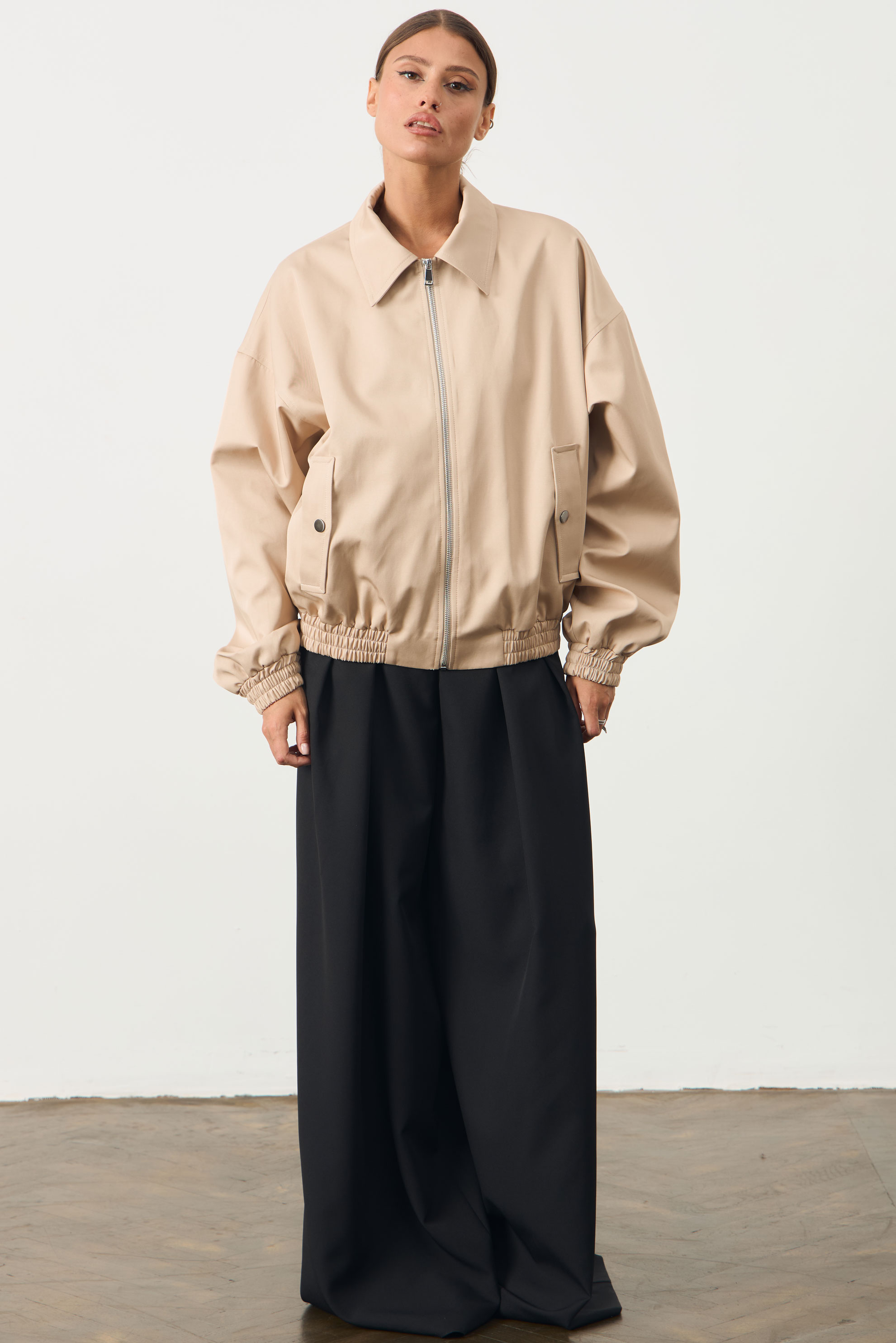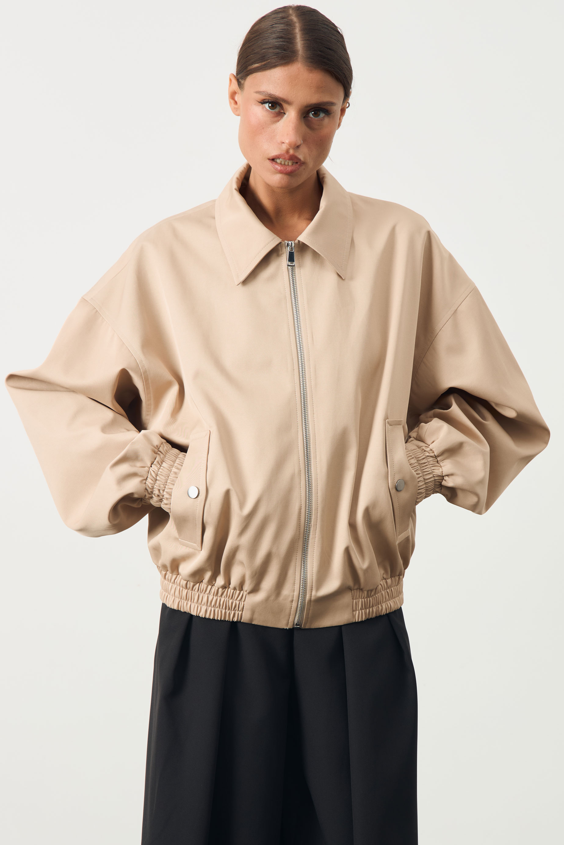 Куртка прямого силуэта. По переду куртки прорезные карманы с клапанами. На спинке кокетка. Воротник рубашечного типа. Рукав широкий с манжетой на резинке. Низ изделия обработан притачным поясом на резинке. Застежка-молния.