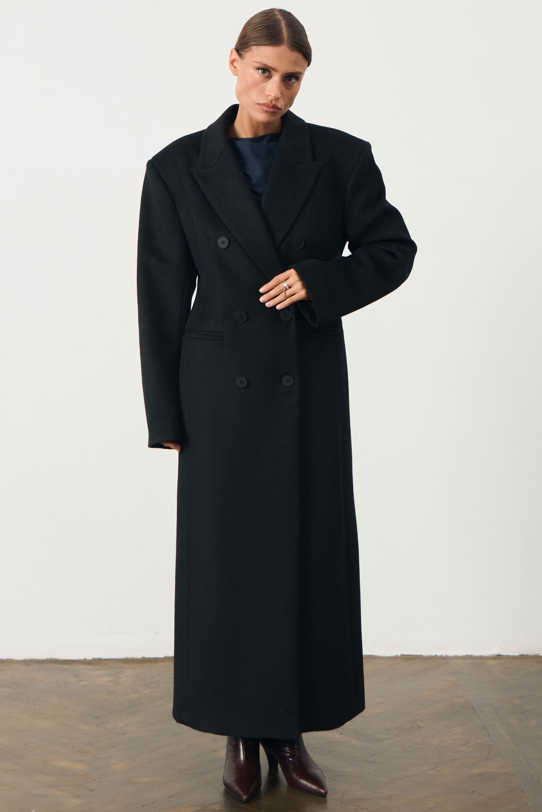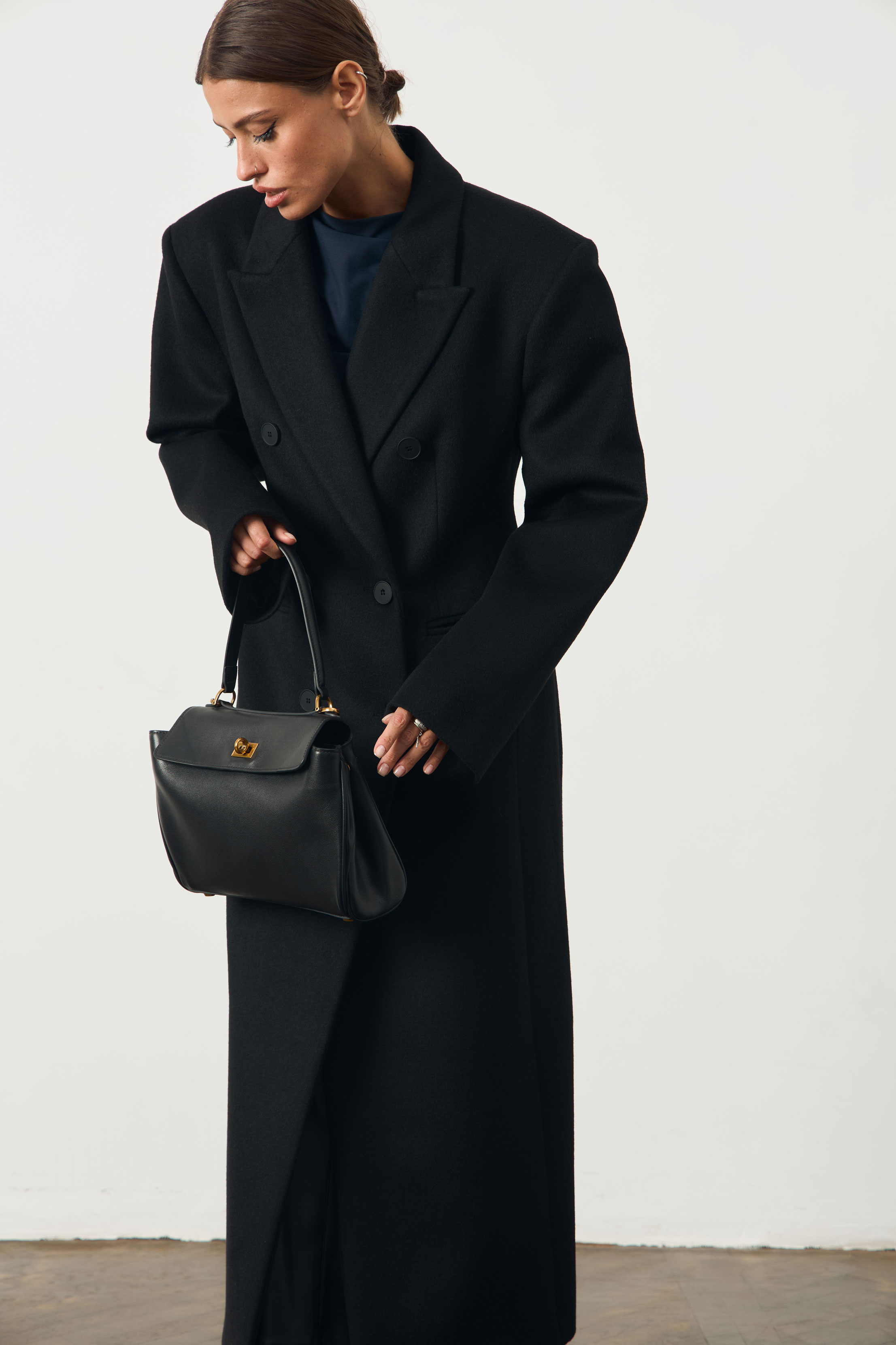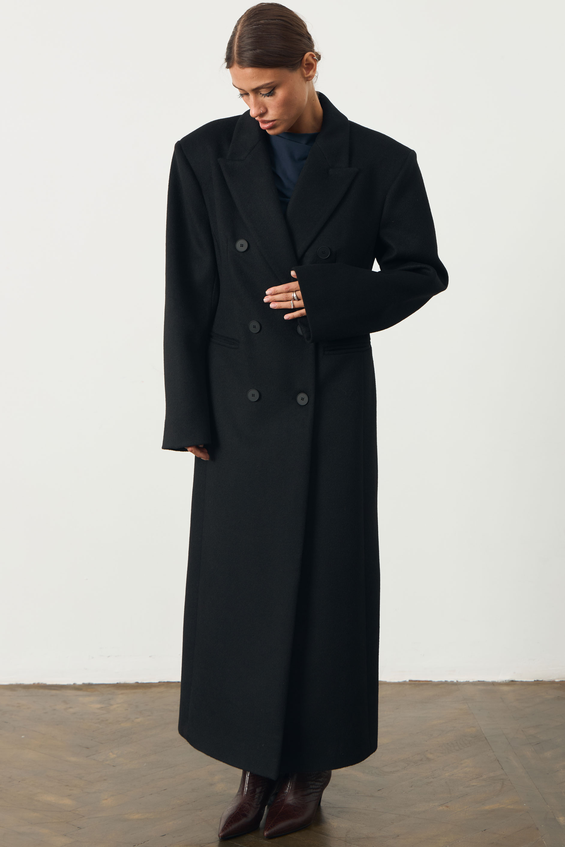 Пальто из шерстяной ткани полуприлегающего силуэта. По переду изделия карманы с листочками, воротник с заострёнными лацканами. Модель двубортная с пуговицами. По спинке разрез шлица.