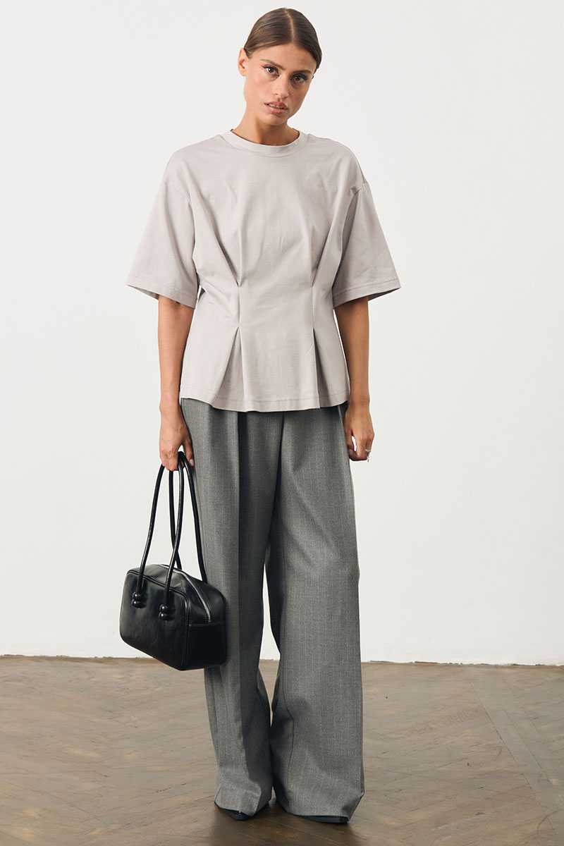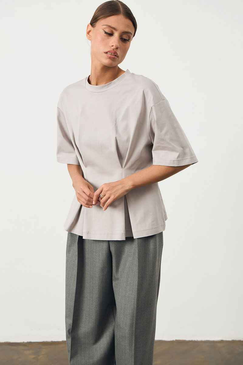Футболка приталенного кроя со спущенным рукавом. По переду декорирована складками.
