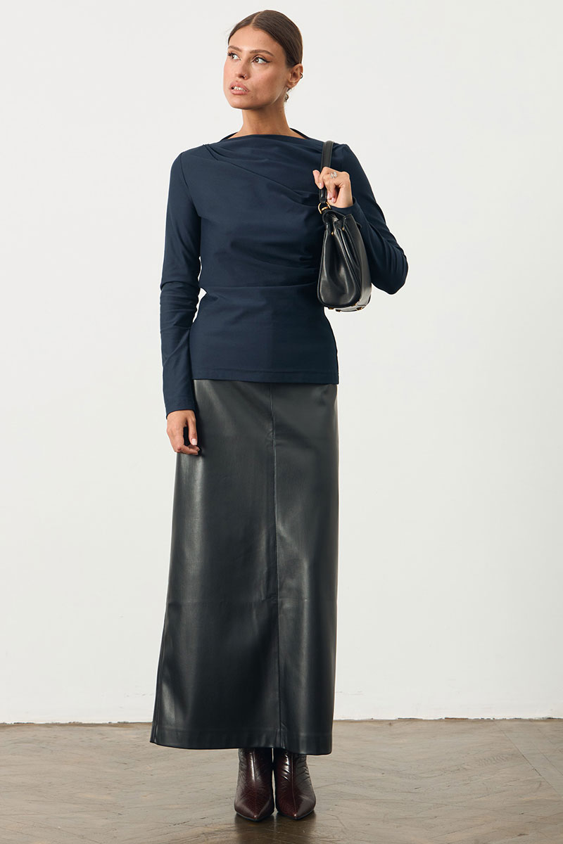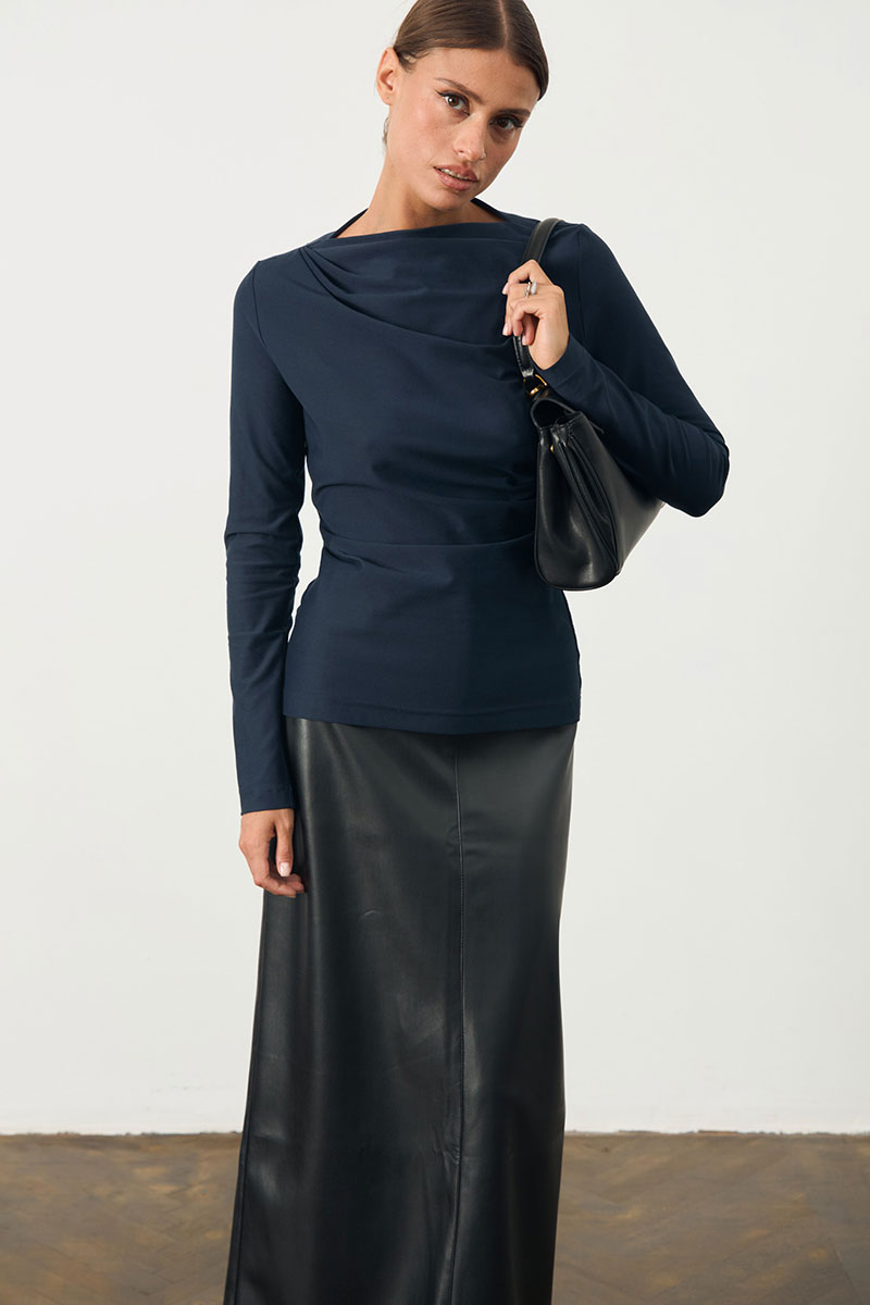 Джемпер трикотажный с длинным рукавом. Горловина-лодочка. Декорирован складками по переду.