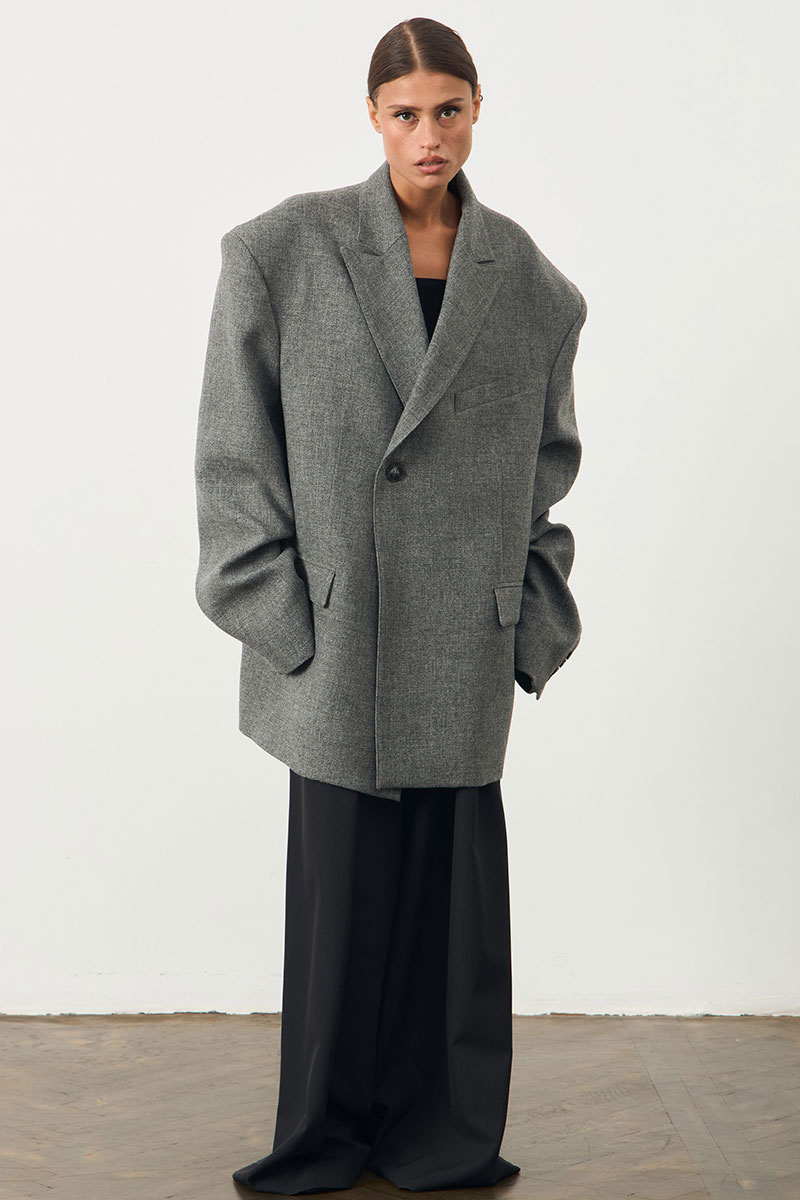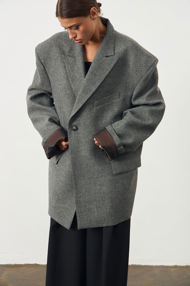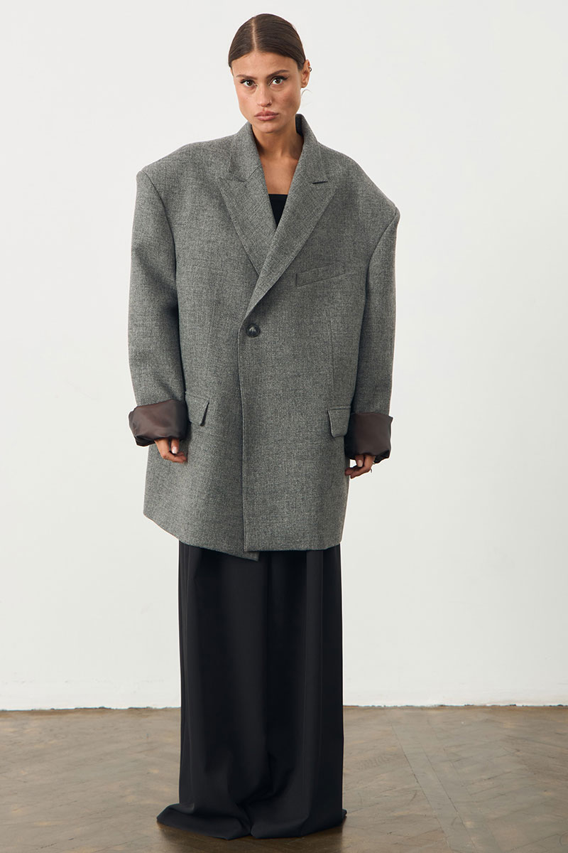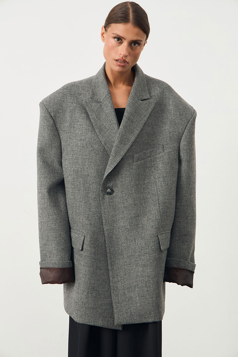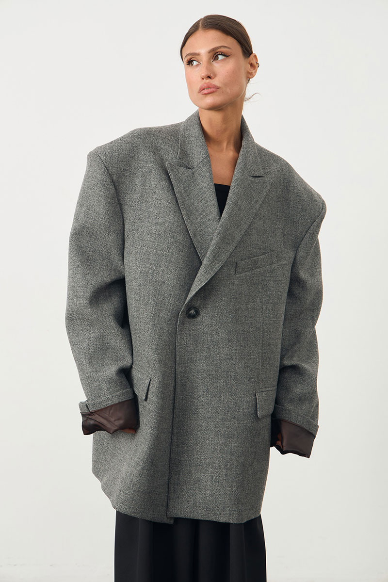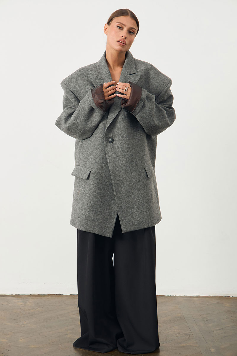 Оверсайз жакет с удлиненной линией плеча. Застежка на пуговицу. По переду изделия карманы с листочкой. Жакет на подкладке.