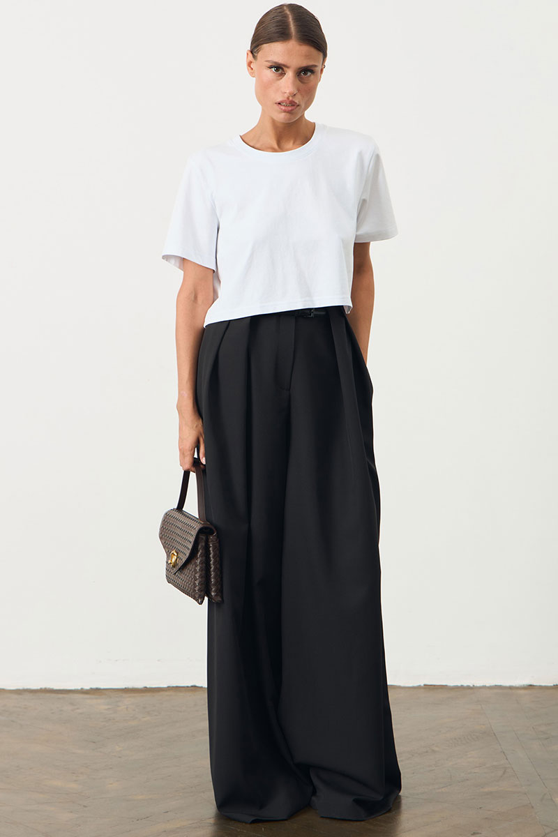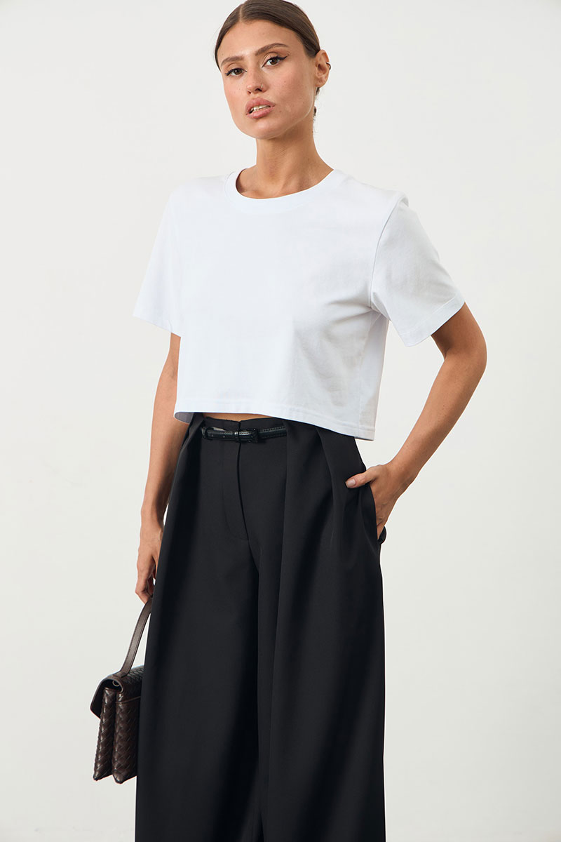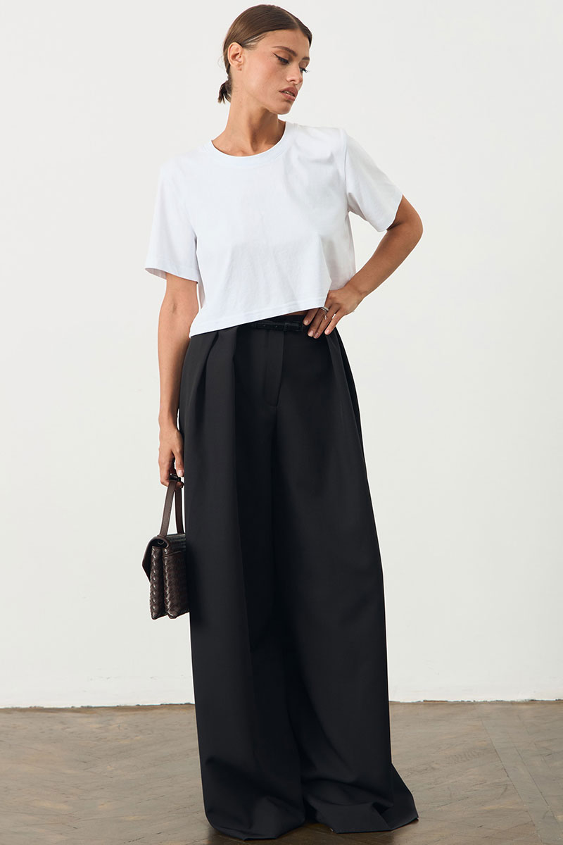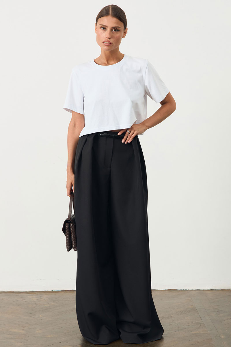 Брюки свободного кроя со складками. Брюки широкие к низу. Изделие на поясе. В боковых швах карманы.