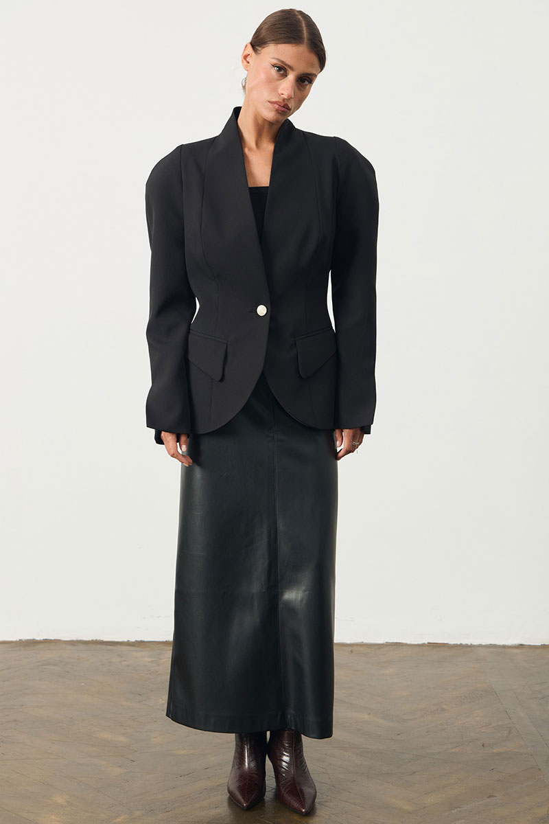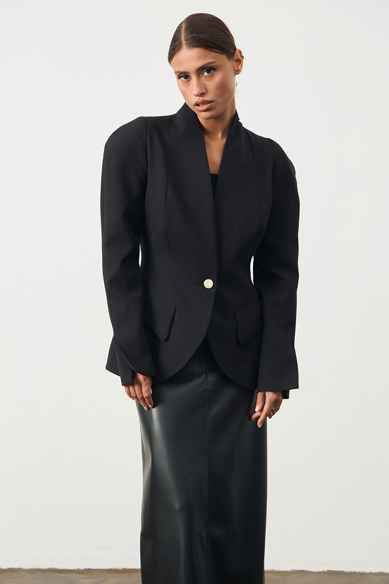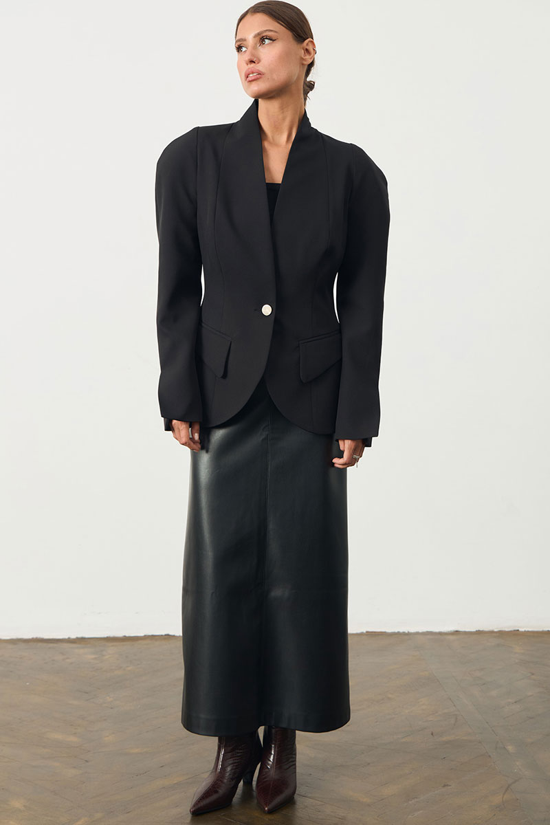 Жакет малого объема, приталенного силуэта, на притачной подкладке. На спинке рельефы и средний шов. На полочках рельефы. Застежка центральная на обметанную петлю и пуговицу. Линия плеча расширена. Рукава полуреглан, длинные, двухшовные. По низу рукава шлица с пришивными пуговицами. Воротник-стойка цельнокроеный. Длина выше линии бедер.