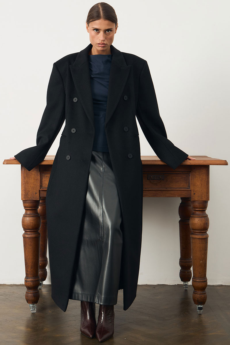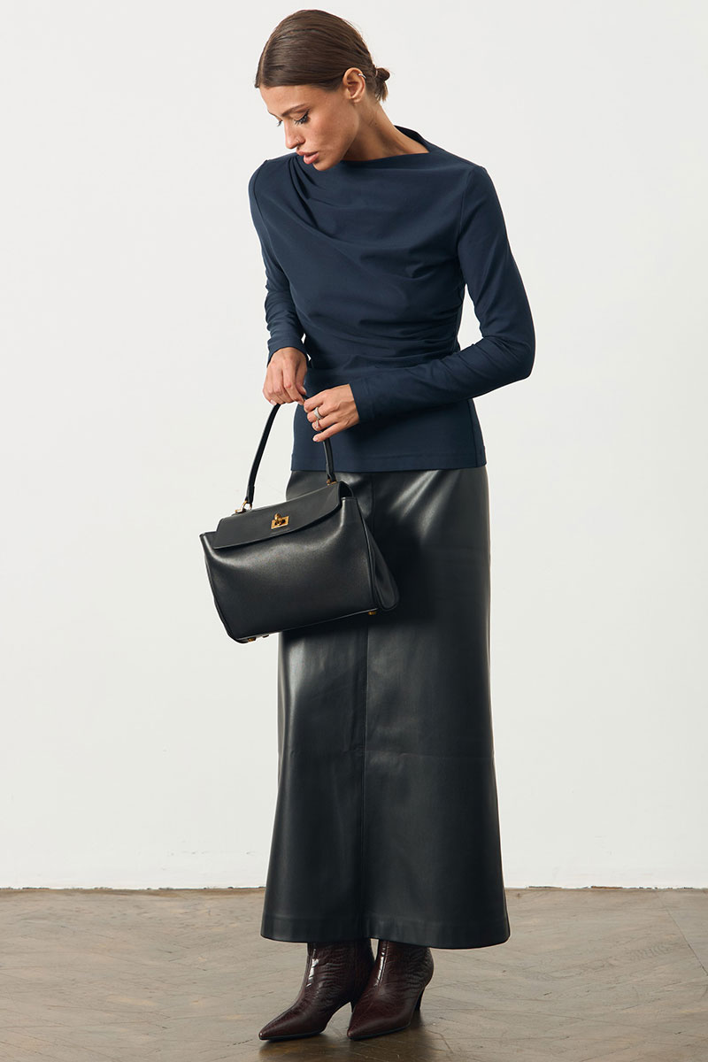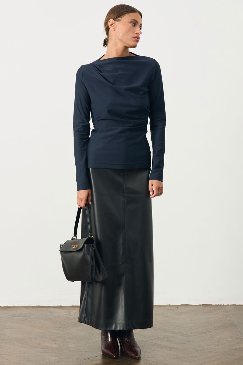 Юбка в длине миди из экокожи. Юбка на поясе, по переду потайная молния.