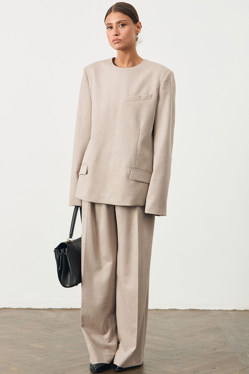 Брюки прямого свободного кроя. Пояс стабильный. Брюки приталенные, расширенные к низу. По передней части прошитые швы.