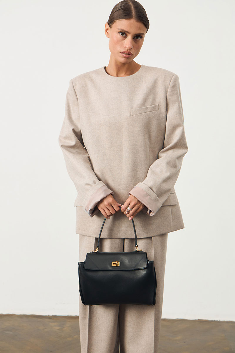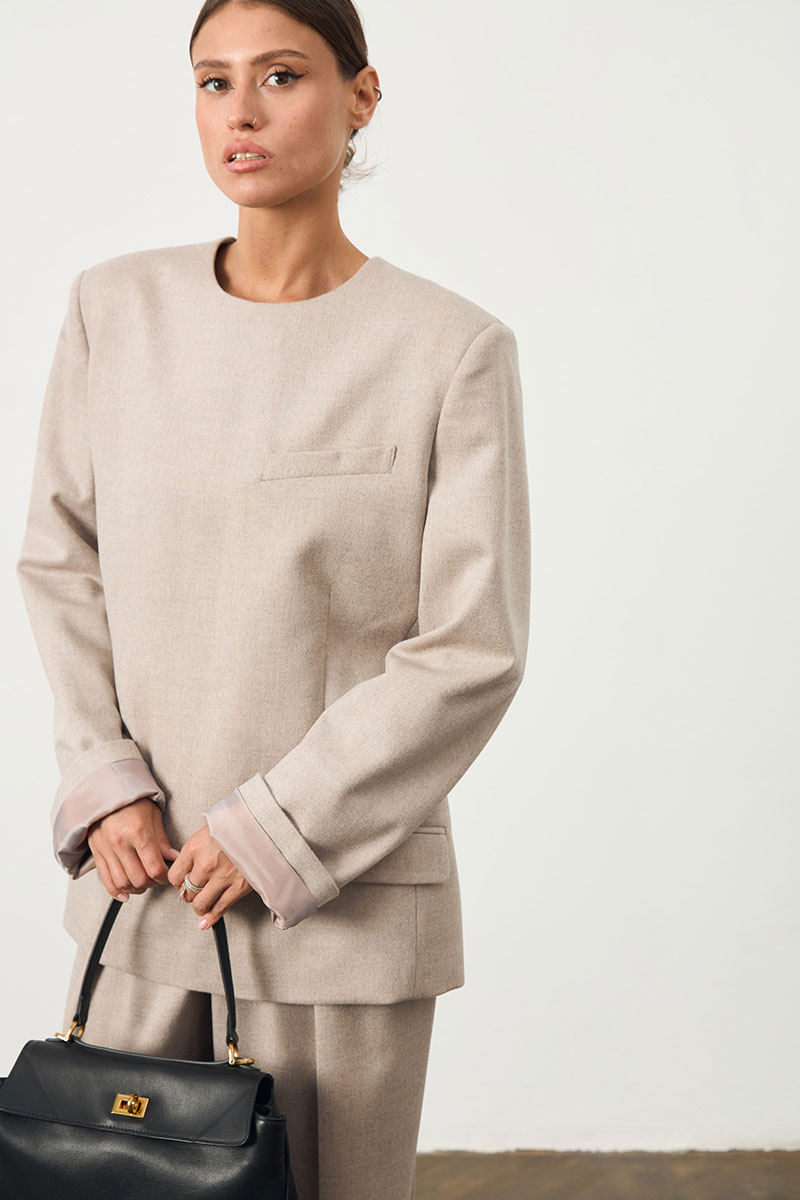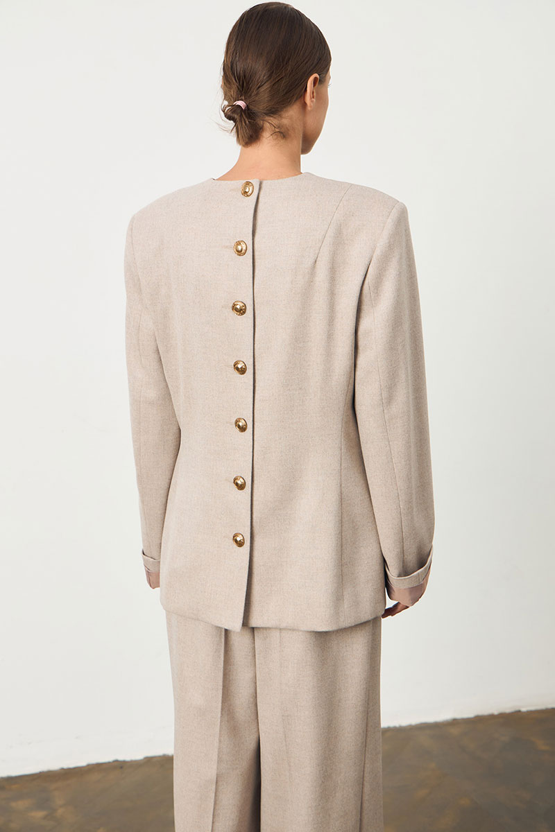 Жакет прямого свободного кроя. По переду бокавые клапаны. По спинке функциональная застежка на декоративные пуговицы. Рукав втачной, линия плеча слегка увеличена, есть подплечники. По низу рукава белая подкладка, которую можно использовать, как манжет. Жакет на подкладке.