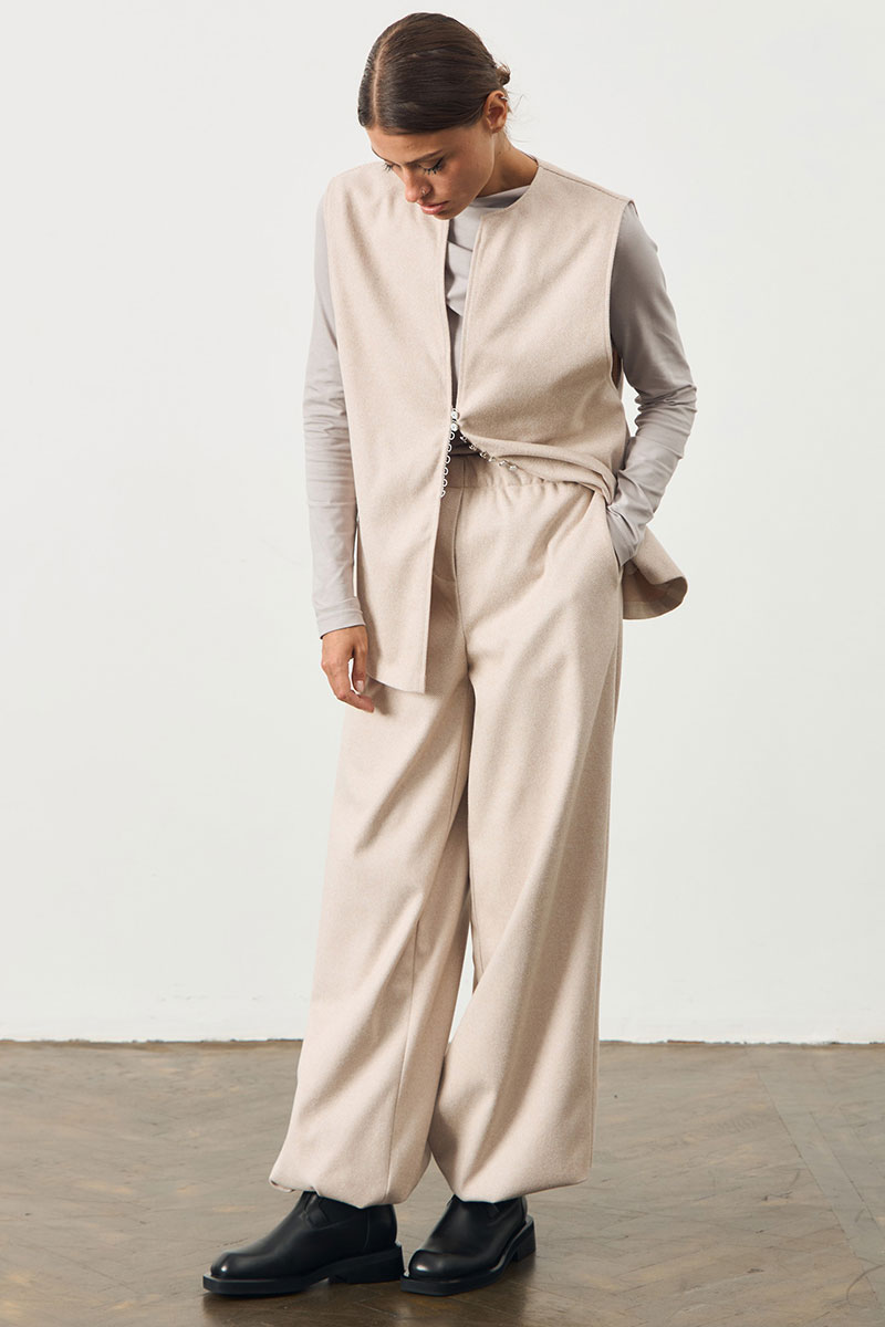 Жилет свободного кроя ниже линии бедра. Застежка на потайной коючок.