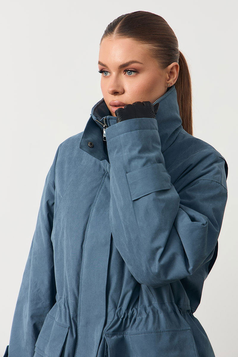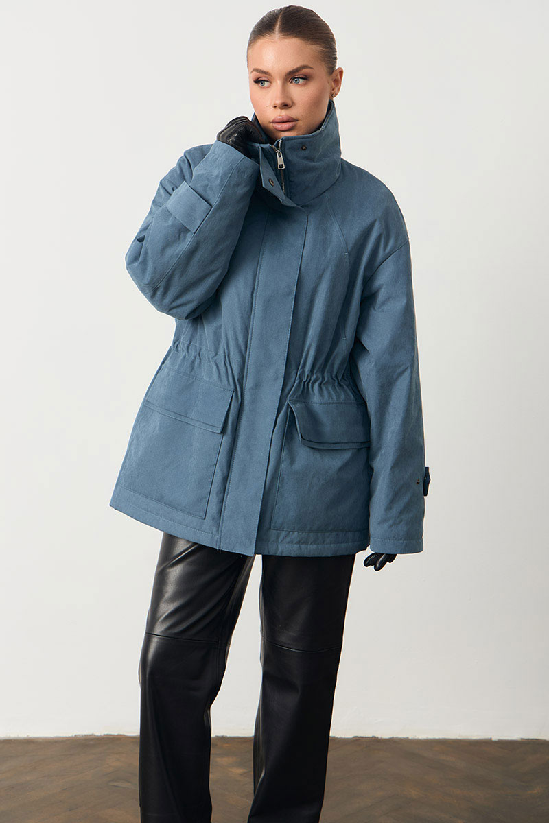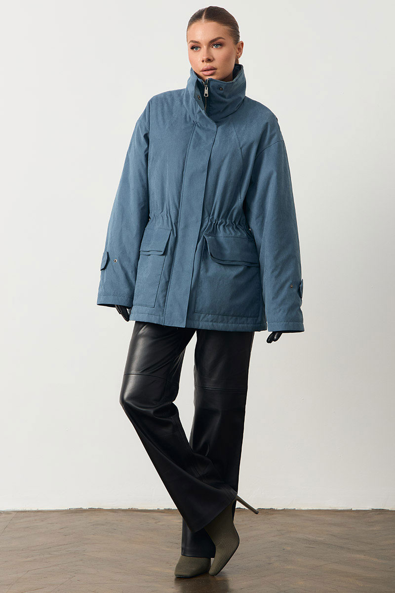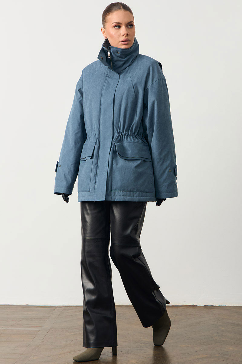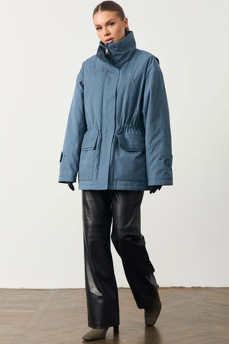 Женская куртка с высоким воротом. На поясе кулиска. Изделие прямого кроя.