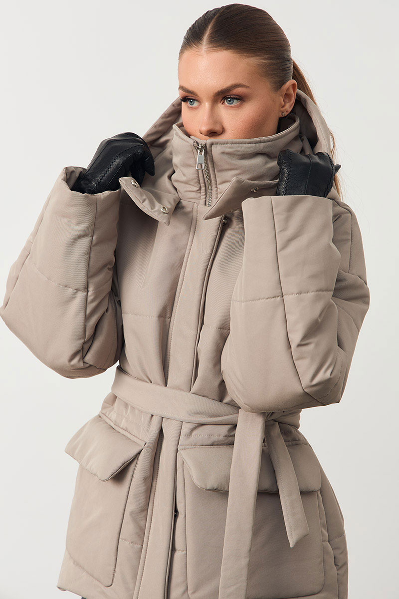 Женская осенняя куртка с капюшоном. Модель выполнена из водоотталкивающего материала. Изделие с утеплителем. Застежка тесьма-молния с планкой на кнопках. Капюшон съёмный. По переду изделия накладные карманы.