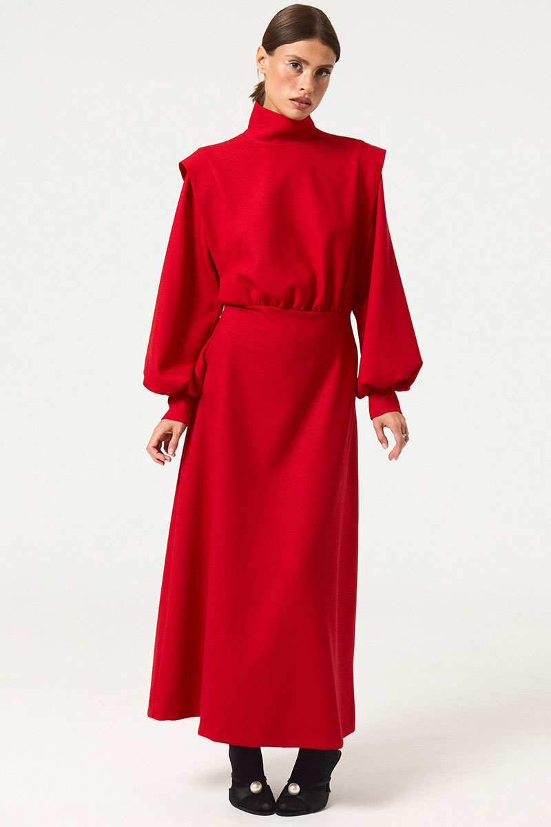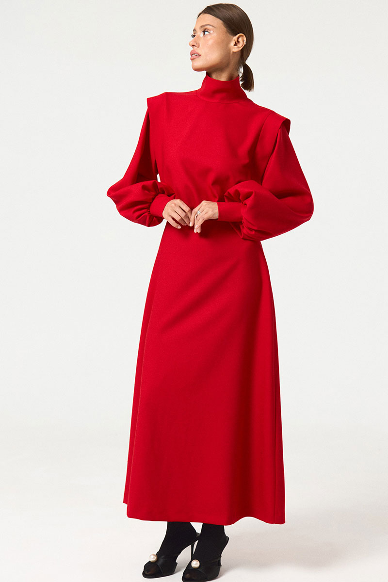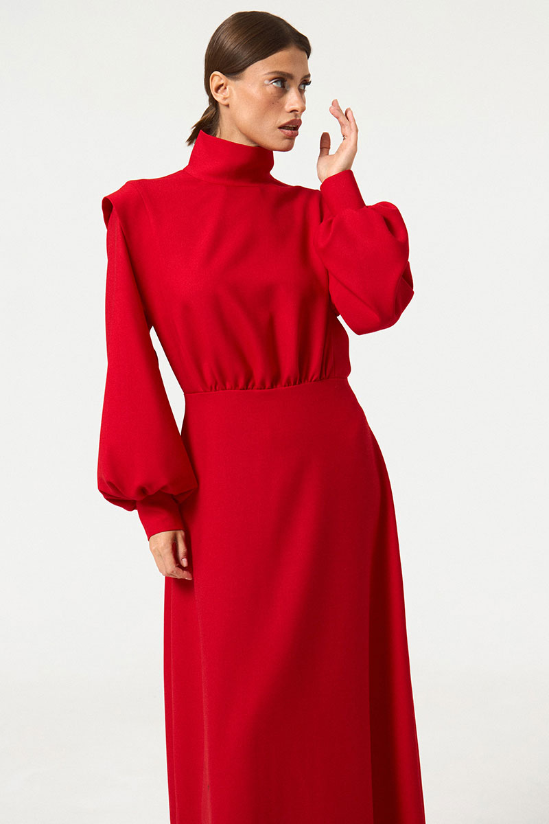 Платье приталенное, отрезное по линии талии, в длине макси. Перед и спинка верха с вертикальными рельефами от плеча до талии, с втачными декоративными планками в рельефах. По линии талии центральные части переда и спинки лифа собраны. Лиф платья с квадратной проймой. Юбка платья имеет небольшое коническое расширение. Рукава длинные, втачные, одношовные, по низу сборка, низ обработан притачной манжетой. Воротник - стойка. В среднем шве спинки застежка на потайную тесьму «молния»