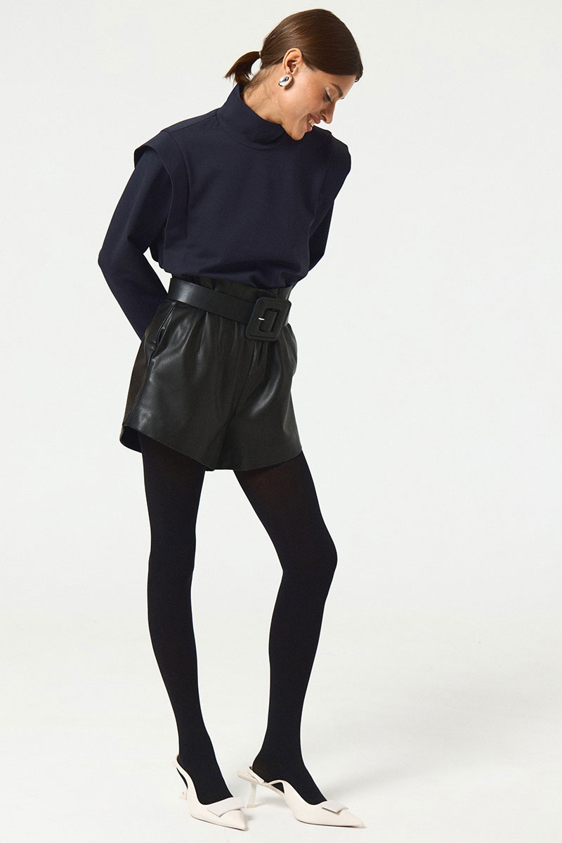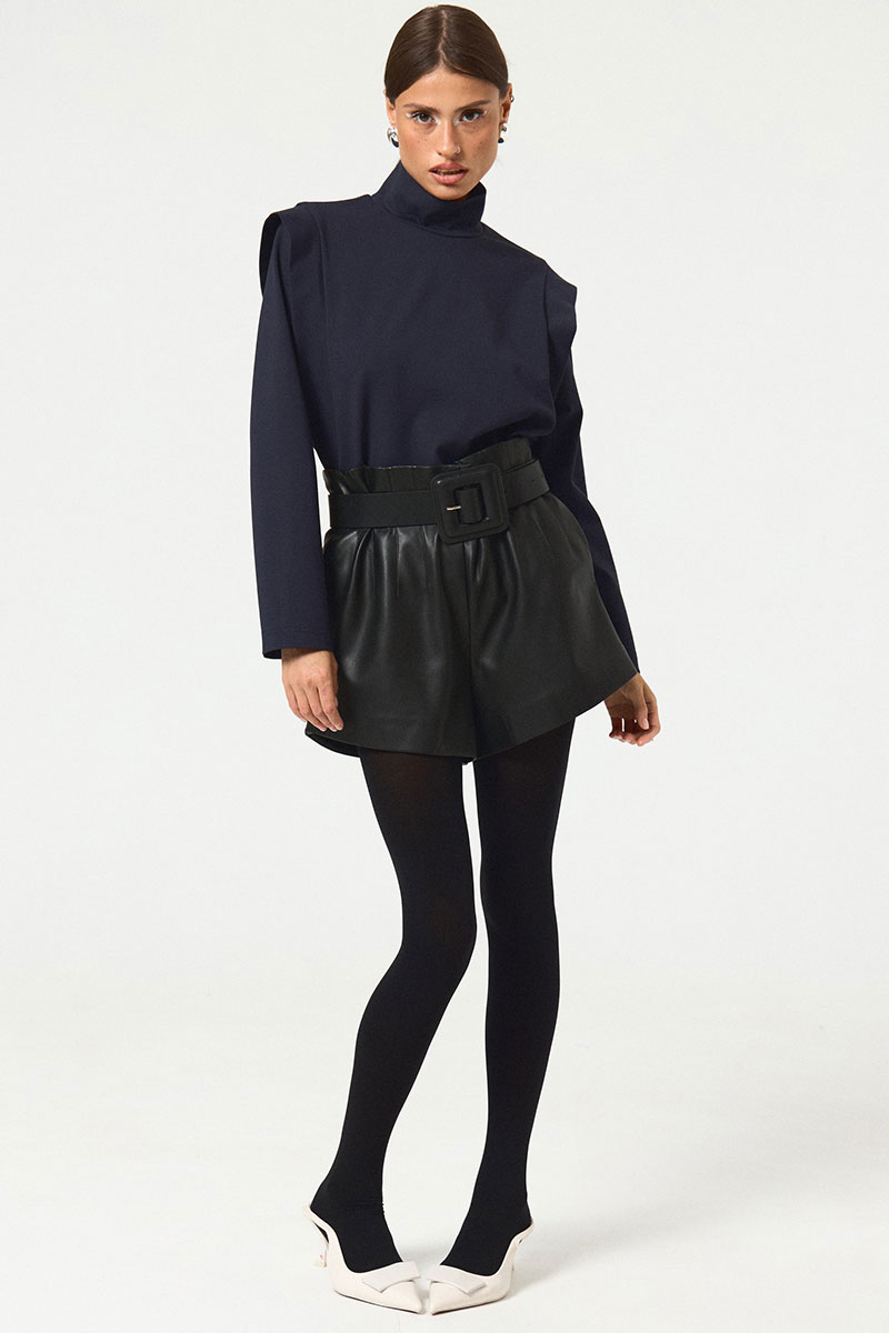 Джемпер среднего объема, длиной до линии талии с напуском, по низу изделия цельнокроеная кулиска с эластичной тесьмой. Перед и спинка с вертикальными рельефами от плеча до низа, с втачными декоративными планками в рельефах. Джемпер с квадратной проймой. Рукава длинные, втачные, одношовные. Воротник - стойка. В среднем шве спинки застежка на потайную тесьму «молния»