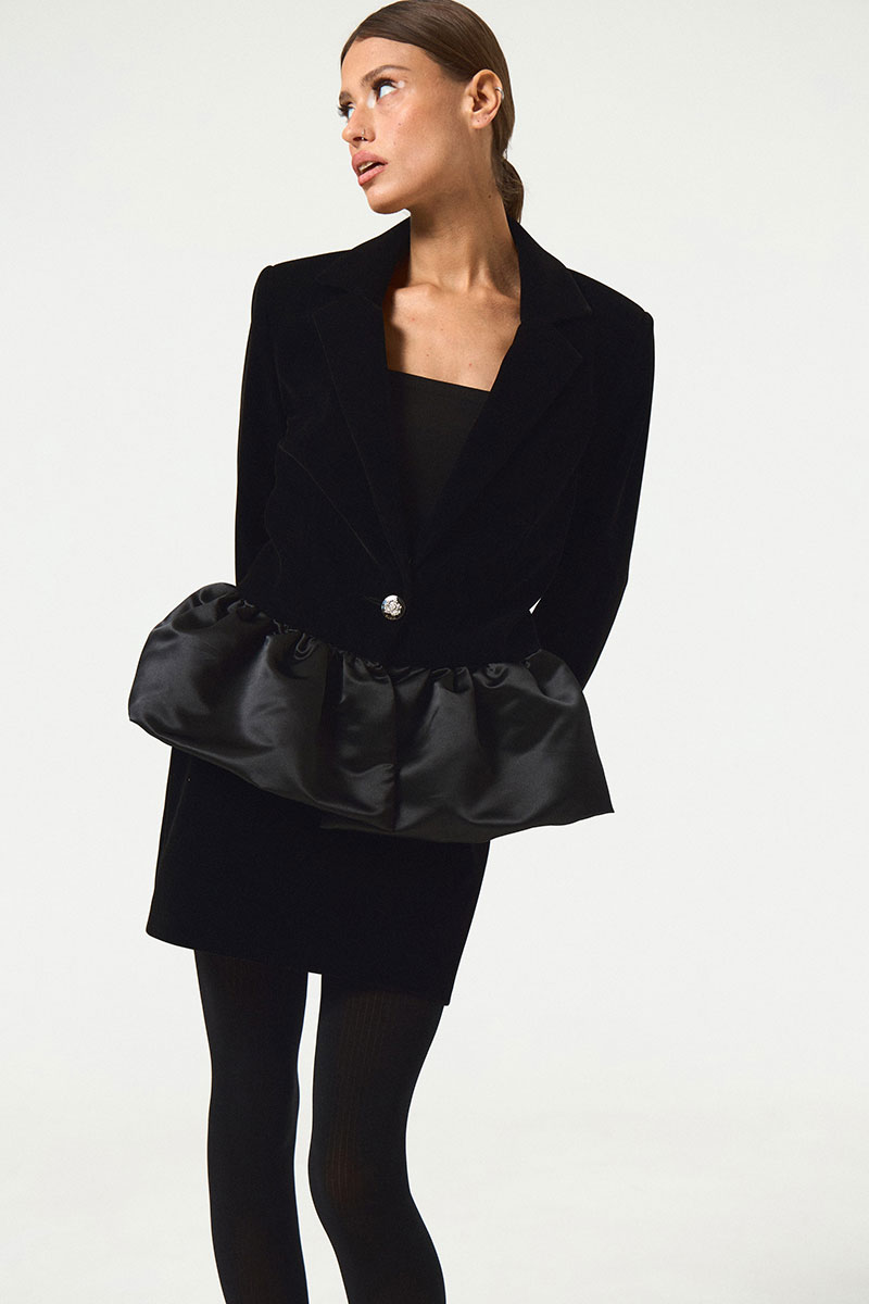 Жакет прилегающего силуэта. Отрезной по линии талии. Баска из отделочной ткани. Жакет с длинным рукавом. Горловина обработана воротником с лацканом. Жакет на подкладке. Юбка в длине мини, на подкладке. Застежка в жакете на 1 пуговицу.