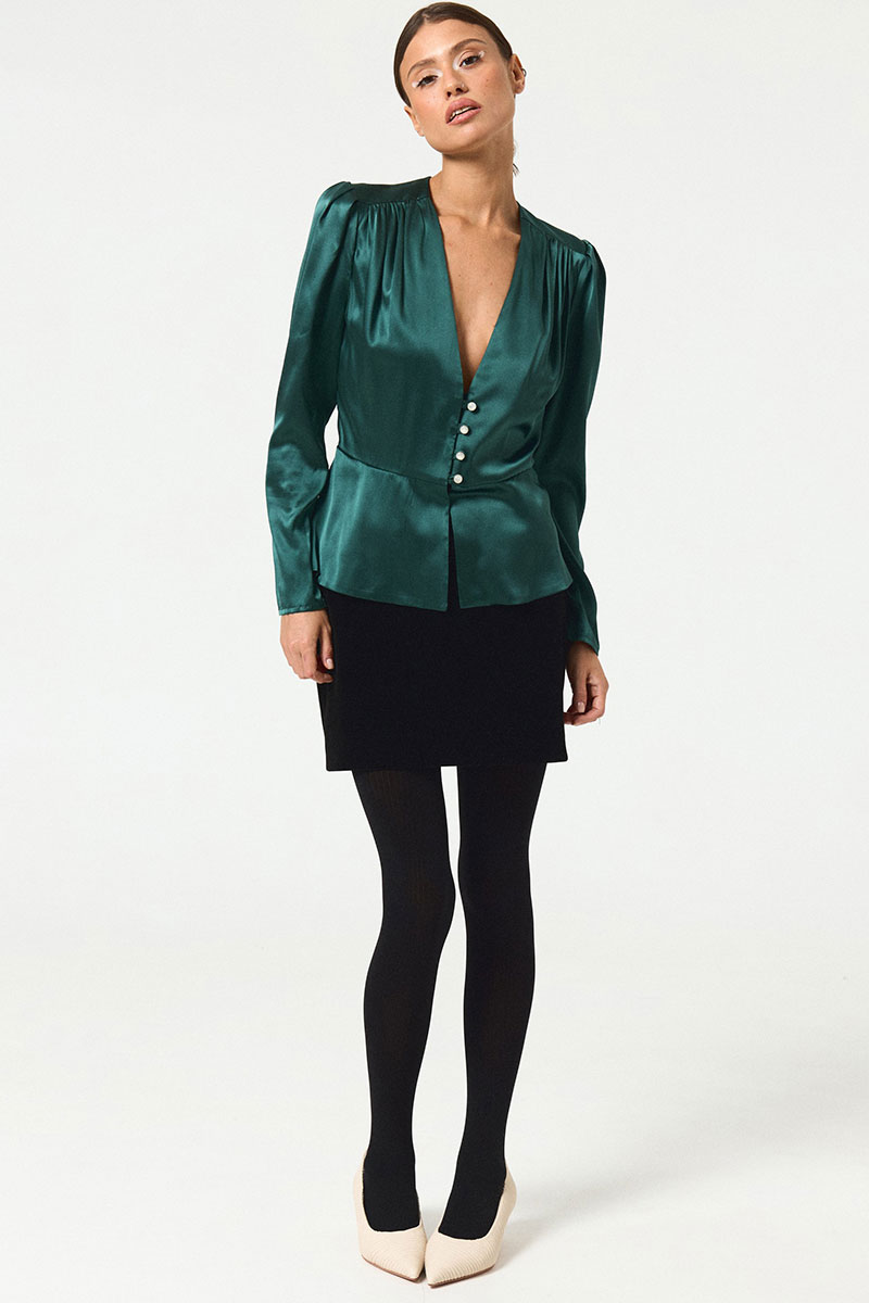 Блузка прилегающего силуэта. По переду отрезная кокетка. По верхнему краю детали переда выполнена сборка. Вырез горловины глубокий, V-образной формы. Застежка центральная. Рукав длинный, втачной, зауженный книзу, со складками по окату. По линии талии притачная двойная баска. Длина блузки выше линии бедер.