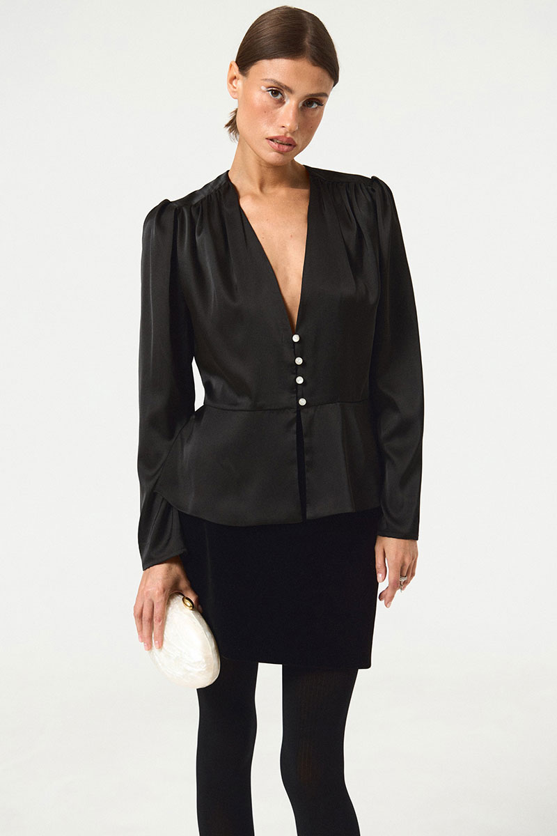 Блузка прилегающего силуэта. По переду отрезная кокетка. По верхнему краю детали переда выполнена сборка. Вырез горловины глубокий, V-образной формы. Застежка центральная. Рукав длинный, втачной, зауженный книзу, со складками по окату. По линии талии притачная двойная баска. Длина блузки выше линии бедер.