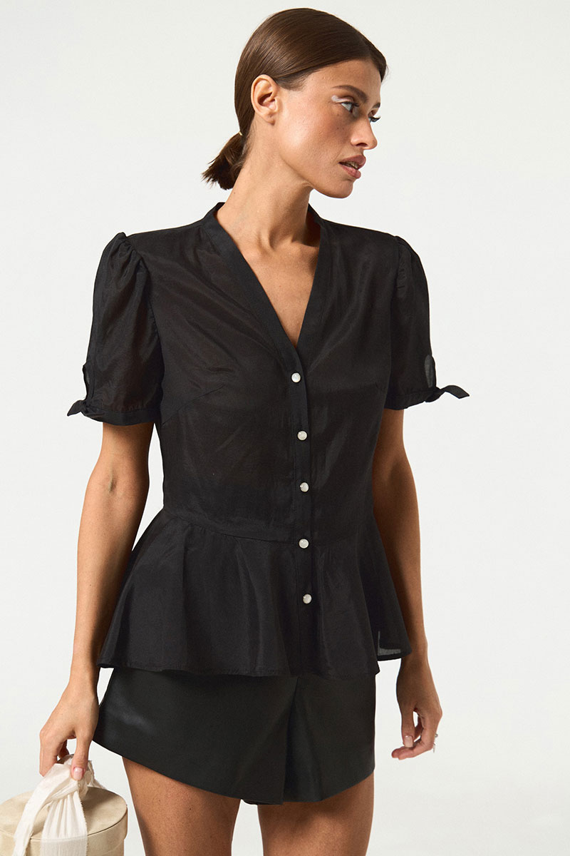 Женская блузка прилегающего силуэта, с центральной застежкой, с баской и коротким рукавом. Перед с нагрудными вытачками из бокового шва. Спинка без среднего шва, с талиевыми вытачками. Рукава длиной до середины плеча, со сборкой по окату, с притачной манжетой. Застежка по притачной планке борта на пуговицы.
