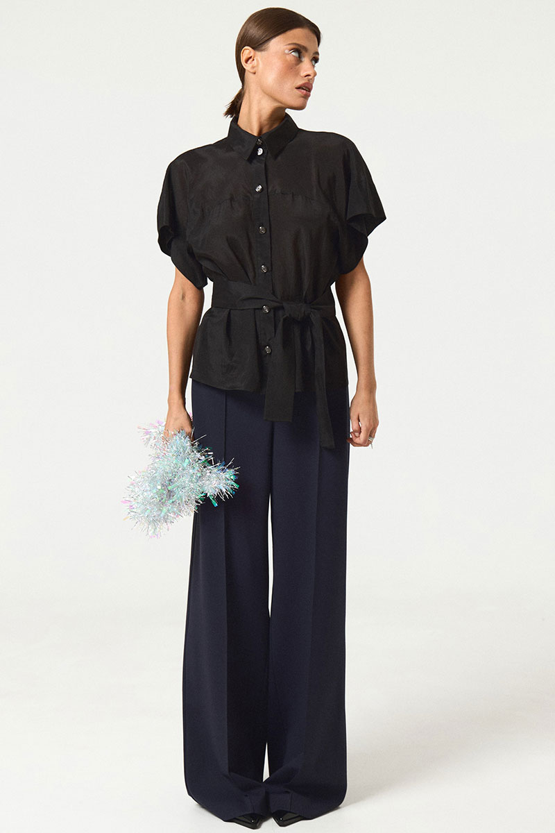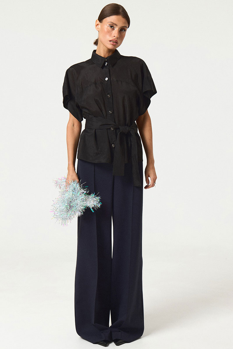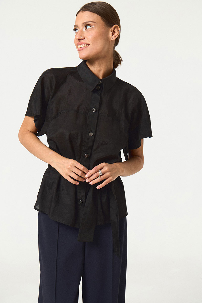 Блузка женская прямого силуэта, со съемным поясом. Перед с центральной застежкой на притачной планке. Воротник стояче-отложной с цельнокроеной стойкой.